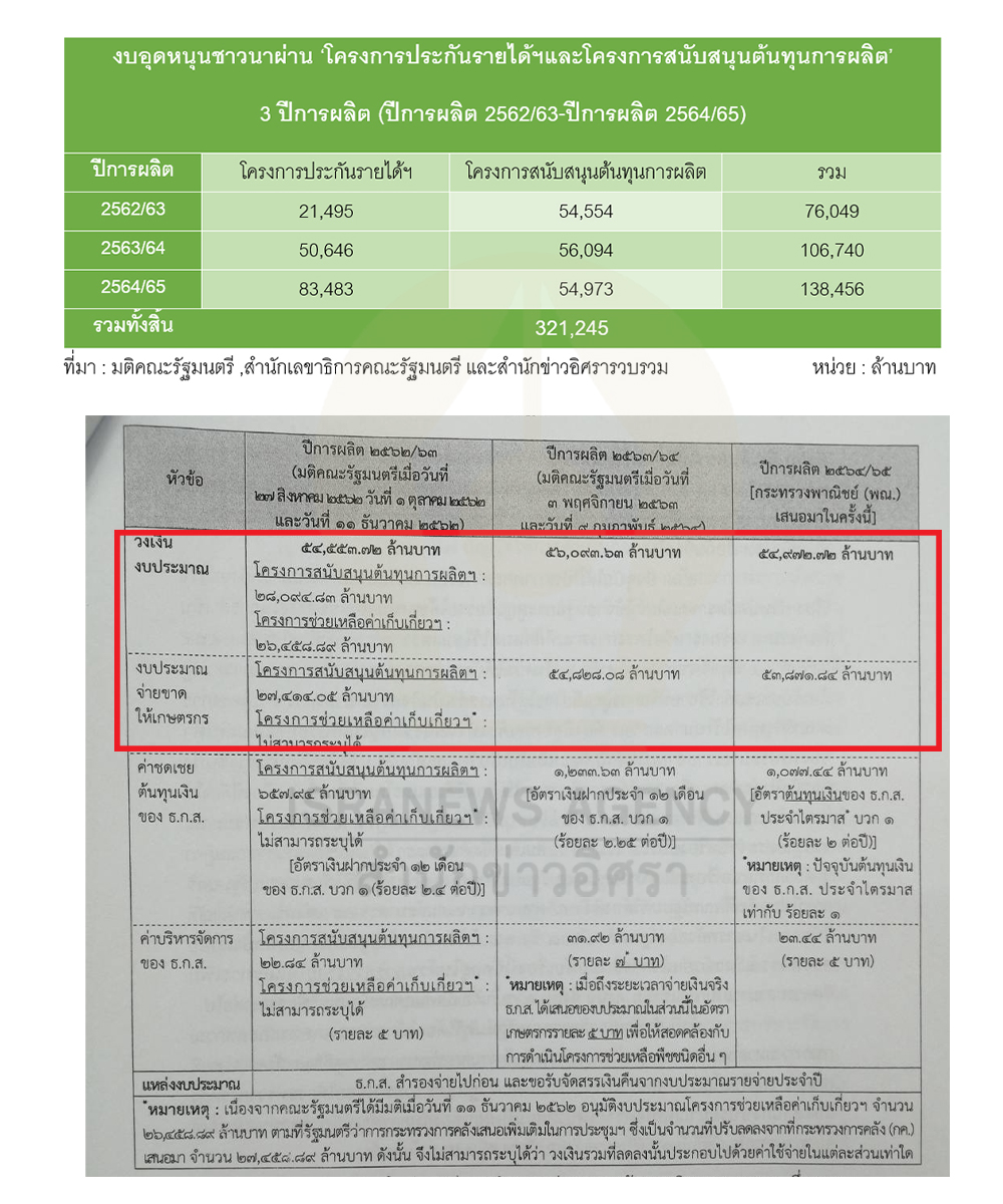 นับตั้งแต่ฤดูกาลผลิตข้าว ปีการผลิต 2562/63 จนถึงปีการผลิต 2564/65 รัฐบาลอนุมัติจัดสรรงบอุดหนุนชาวนาโดยตรง (ไม่รวมมาตรการคู่ขนาน) ผ่านโครงการประกันรายได้เกษตรกรผู้ปลูกข้าวและโครงการสนับสนุนต้นทุนฯ รวมแล้ว 321,245 ล้านบาท ได้แก่