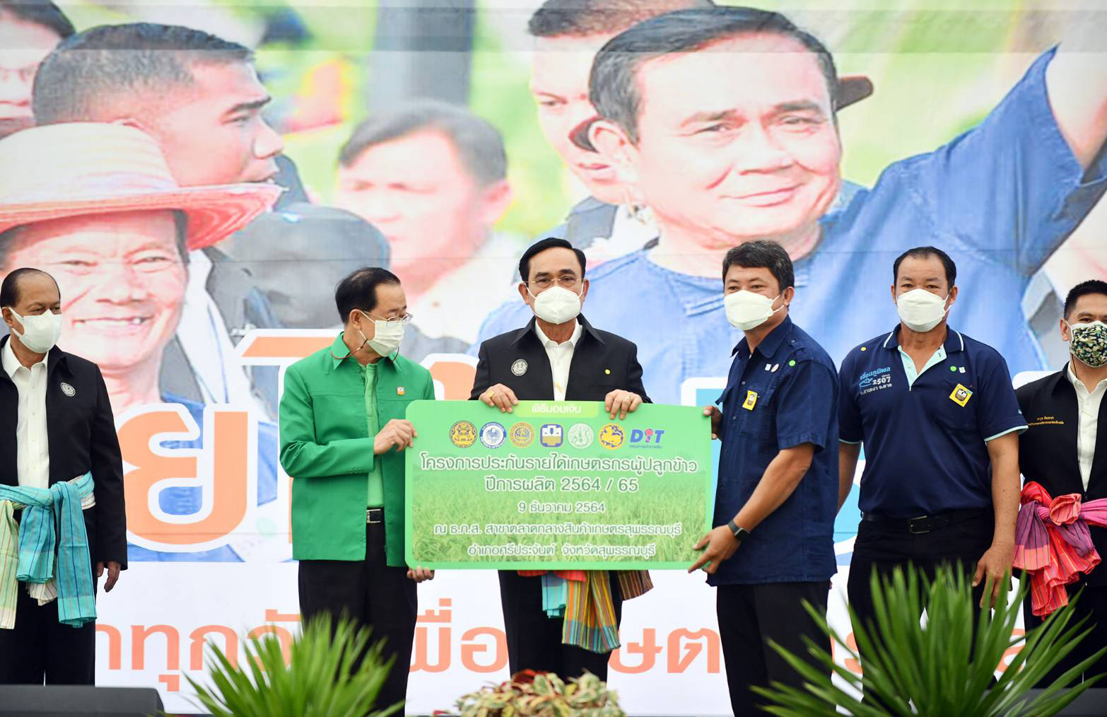 (พล.อ.ประยุทธ์ จันทร์โอชา นายกฯ เป็นประธานในพิธีมอบเงินตามมาตรการช่วยเหลือเกษตรกรผู้ปลูกข้าวโครงการประกันรายได้เกษตรกรผู้ปลูกข้าวและมาตรการคู่ขนาน ปีการผลิต 2564/65 ณ ธ.ก.ส. สาขาตลาดกลางสินค้าเกษตรสุพรรณบุรี อ.ศรีประจันต์ จ.สุพรรณบุรี เมื่อวันที่ 9 ธ.ค.2564 ที่มาภาพ : ทำเนียบรัฐบาล)