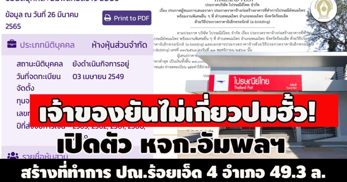 - เจาะสร้างที่ทำการ ปณ.ร้อยเอ็ด รับเหมาเจ้าเดียว ได้งาน 3 ปีรวด 4 ส. 4 อำเภอ 49.3 ล.