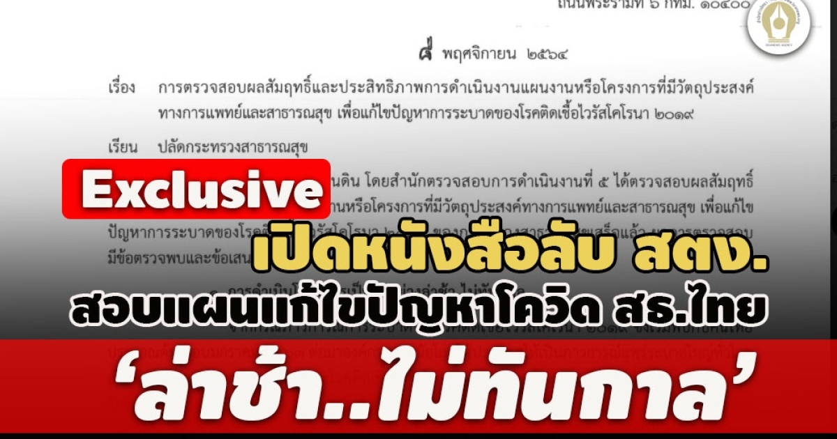 สำนักข่าวอิศรา (www.isranews.org) รายงานว่า ในช่วงเดือน พฤศจิกายน 2564 สตง. ได้ทำหนังสือแจ้งปลัดกระทรวงสาธารณสุข เกี่ยวกับการตรวจสอบผลสัมฤทธิ์และประสิทธิภาพการดําเนินงานแผนงานหรือโครงการที่มีวัตถุประสงค์ทางการแพทย์และสาธารณสุข เพื่อแก้ไขปัญหาการระบาดของโรคติดเชื้อไวรัสโคโรนา 2019 ระบุว่า