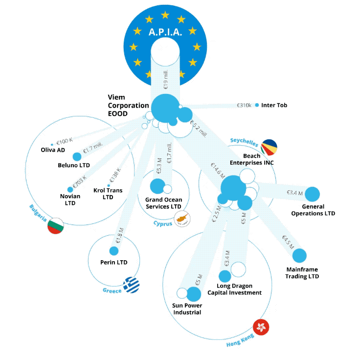 แต่สิ่งที่อียูไม่ได้รับรู้ก็คือว่าบริษัทเวียมนั้นมีโครงสร้างซึ่งถูกควบคุมโดยองค์กรที่ถูกกล่าวหาว่าเป็นองค์กรอาชญากรรมจากประเทศบัลแกเรียจำนวนสององค์กรด้วยกัน ซึ่งเอกสารทางธนาคารที่รั่วไหลฉบับหนึ่งนั้นแสดงให้เห็นว่าในช่วงวันหนึ่งในเดือน ต.ค. 2555 เวียมได้มีการขโมยเงินจำนวนกว่า 19 ล้านยูโร ซึ่งเงินดังกล่าวนั้นเป็นเงินที่ควรจะต้องนำไปใช้ในโครงการสนับสนุนด้านอาหาร แต่ทว่าเงินกลับถูกนำไปโยกย้ายถ่ายเทผ่านเครือข่ายของบริษัทนอกอาณาเขต ซึ่งจากข้อมูลของบันทึกบัตรเครดิตนั้นพบว่ามีการใช้เงินในก้อนดังกล่าวไปกับทั้งโรงแรมหรู,มื้อค่ำราคาแพง และกระเป๋าแบรนด์เนมอย่างน้อยหนึ่งรายการ ขณะที่พยานซึ่งให้ปากคำกับอัยการนั้นได้ยืนยันว่าเงินดังกล่าวมีที่มาจากการทุจริตอย่างแน่นอน
