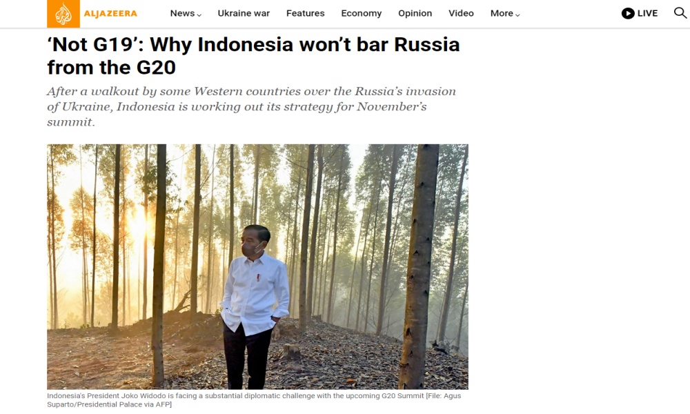 ประเทศอินโดนีเซีย ณ เวลานี้นั้นกำลังอยู่ในระหว่างปรึกษาหารือในประเด็นสำคัญกับกลุ่มประเทศG-20 อื่นๆ ท่ามกลางเสียงเรียกร้องว่าประเทศอินโดนีเซียต้องแบนไม่ให้รัสเซียเข้าร่วมการประชุมG-20 ที่เกาะบาหลีในเดือน พ.ย.ที่จะถึงนี้