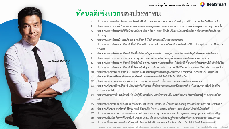 โซเชียลมีเดียแสดงทัศนคติในเชิงบวกต่อนายชัชชาติ รวม 19 ข้อ คือ 1.แสดงจุดยืนสนับสนุน เป็นผู้ว่าฯกทม.พร้อมเชิญชวนให้ ร่วมกันเลือกนายชัชชาติ 2.มองว่า เบอร์ 8 เป็นเลขที่บ่งบอกถึงความเจริญก้าวหน้า และเชื่อมั่นว่าจะทำให้ กทม.เจริญก้าวหน้า 3.ชื่นชมคลิปวิดีโอนำเสนอปัญหาต่าง ๆ เปรียบปัญหาเป็นเกมชนิดต่าง ๆ ที่ ต้องเล่นเป็นประจำทุกวัน
