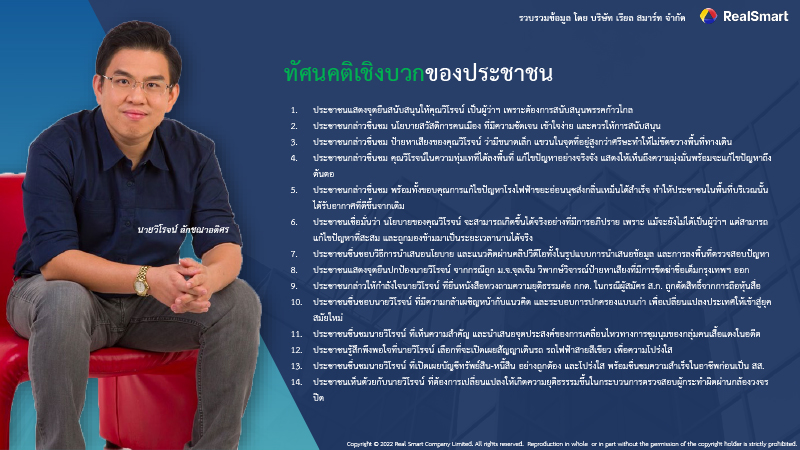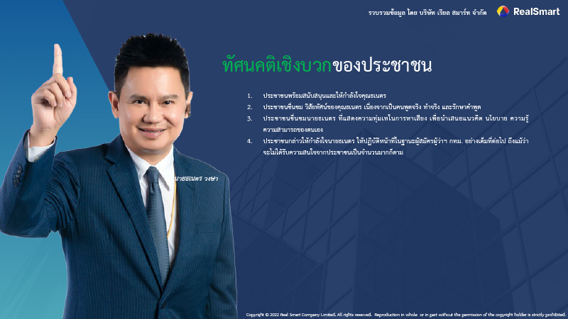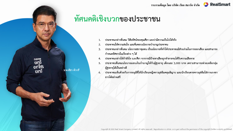 12.พึงพอใจในการเลือกที่จะเปิดเผยสัญญาเดินรถรถไฟฟ้าสายสีเขียว เพื่อความโปร่งใส 13.ชื่นชมที่เปิดเผยบัญชีทรัพย์สิน-หนี้สิน อย่างถูกต้อง และโปร่งใส พร้อมชื่นชมความสำเร็จในอาชีพก่อนเป็น ส.ส. และ 14.เห็นด้วยที่ต้องการเปลี่ยนแปลงให้เกิดความยุติธรรรมขึ้นในกระบวนการตรวจสอบผู้กระทำผิดผ่านกล้องวงจรปิด