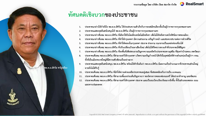 สำหรับรายละเอียดการถูกพูดถึงใน 'เชิงบวก' ของผู้สมัครผู้ว่าฯกทม. 10 คนแรก มีรายละเอียด ดังนี้
