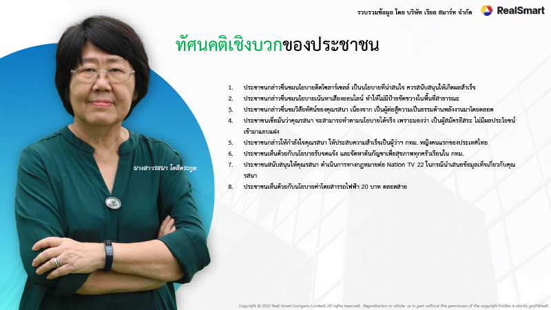 โซเชียลมีเดียแสดงทัศนคติในเชิงบวกต่อ น.ส.รสนา รวม 8 ข้อ คือ 1.ชื่นชมนโยบายติดโซลาร์เซลล์ เป็นนโยบายที่น่าสนใจ ควรสนับสนุนให้เกิดผลสำเร็จ 2. ชื่นชมนโยบายเน้นหาเสียงออนไลน์ ทำให้ไม่มีป้ายขัดขวางในพื้นที่สาธารณะ