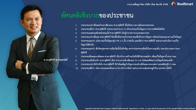 โซเชียลมีเดียแสดงทัศนคติในเชิงบวกต่อ นายสุชัชวีร์ รวม 10 ข้อ คือ 1.ชื่นชมป้ายหาเสียงที่ไม่กีดขวางทางเดิน 2.เชื่อว่าจะสามารถนำระบบ AI เข้ามาช่วยแก้ไขปัญหาการจราจรติดขัดได้จริง 3.แสดงจุดยืนสนับสนุนให้ เป็นผู้ว่าฯกทม.