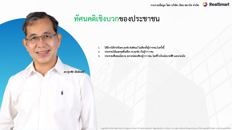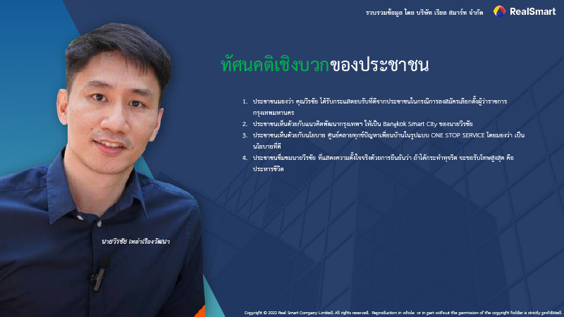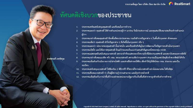 3.ชื่นชมที่ลงพื้นที่สำรวจปัญหาต่าง ๆ ด้วยตนเอง 4.เชื่อว่า เข้าใจปัญหาต่าง ๆ ที่เกิดขึ้นใน กทม.จริง 5.มองว่านโยบายน่าสนใจ เป็นหลักสำคัญในการพัฒนาแก้ไขปัญหารอบด้าน