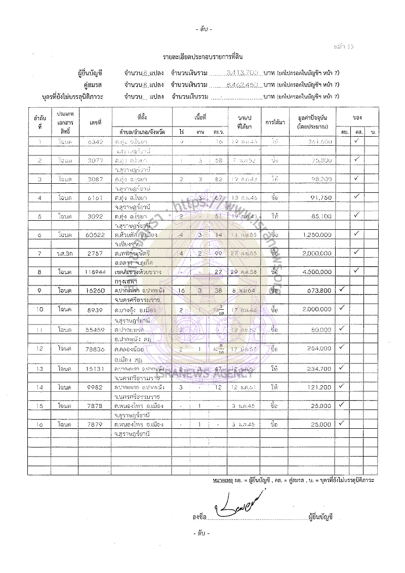 รวมทรัพย์สินทั้งสิ้น 21,095,502.58 บาท (เงินฝาก 20 บัญชี 260,427.55 บาท ที่ดิน 16 แปลง 11,876,150 บาท บ้าน 2 หลัง ห้องชุด 2 ห้อง 6,700,000 บาท) หนี้สิน 1,804,614.31 บาท
