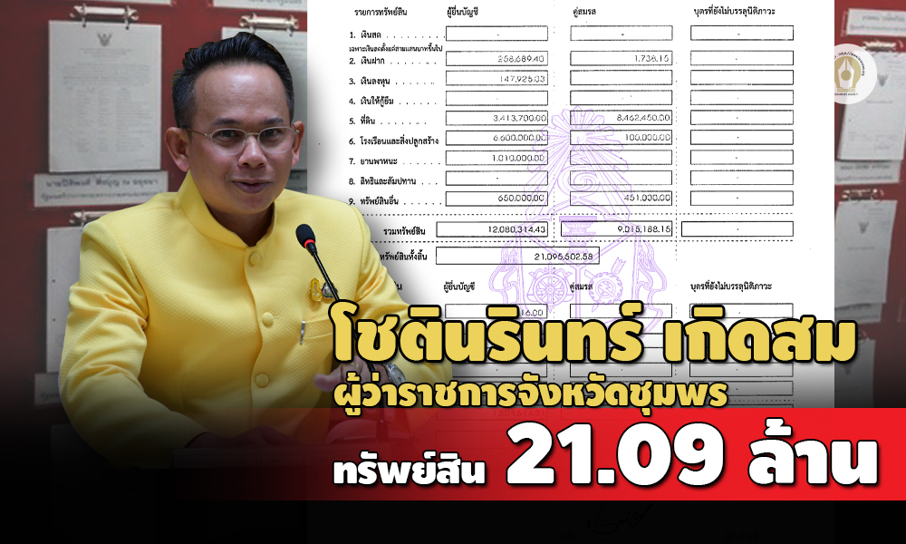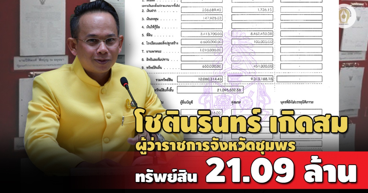 ทรัพย์สิน 21.09 ล้านบาท 'โชตินรินทร์ เกิดสม'ผู้ว่าฯชุมพร ที่ดิน 16 แปลง 11.87 ล้านบาท บ้าน 2 หลัง ห้องชุด 2 ห้อง 6.7 ล้านบาท