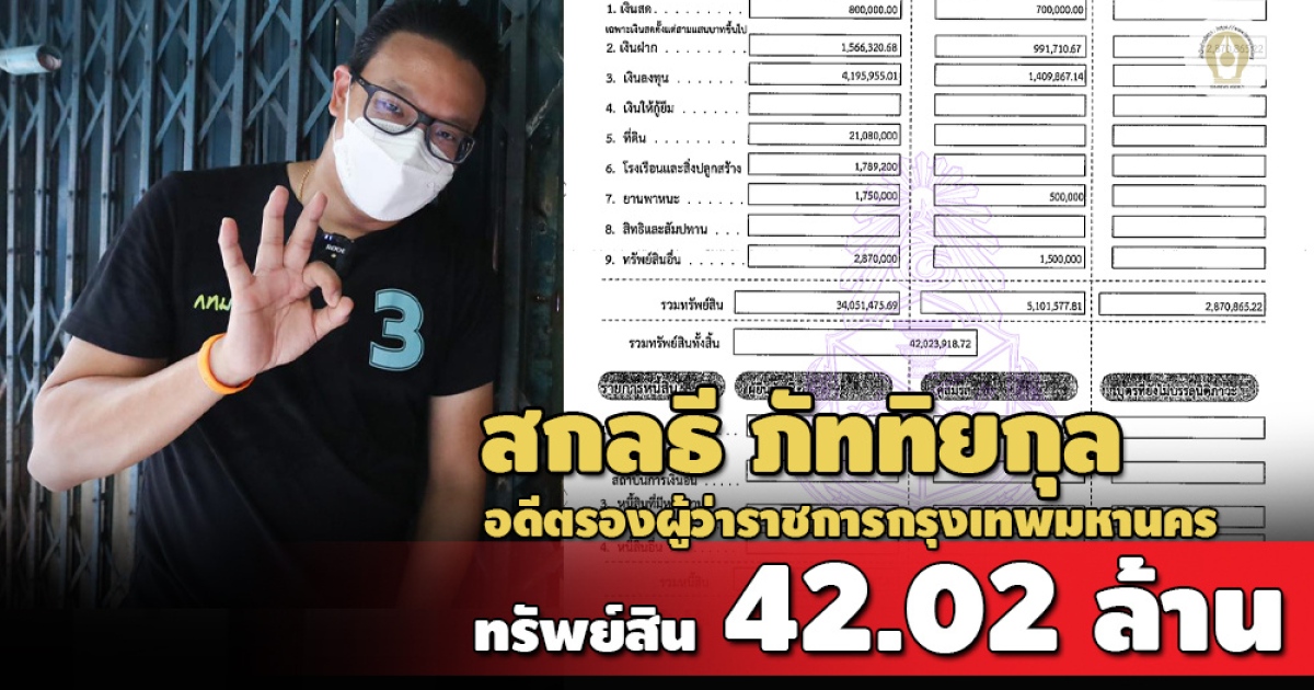 ทรัพย์สิน 42.02 ล้านบาท 'สกลธี ภัททิยกุล' แคนดิเดตผู้ว่าฯ กทม. ที่ดิน 3 แปลง บ้าน 1 หลัง 22.86 ล้านบาท สะสมปืน 16 กระบอก นาฬิกาหรู 4 เรือน ห้อยพระหลวงพ่อทวด ส่วนภรรยา มีนาฬิกาหรู 2 เรือน แหวนเพชร 1 วง