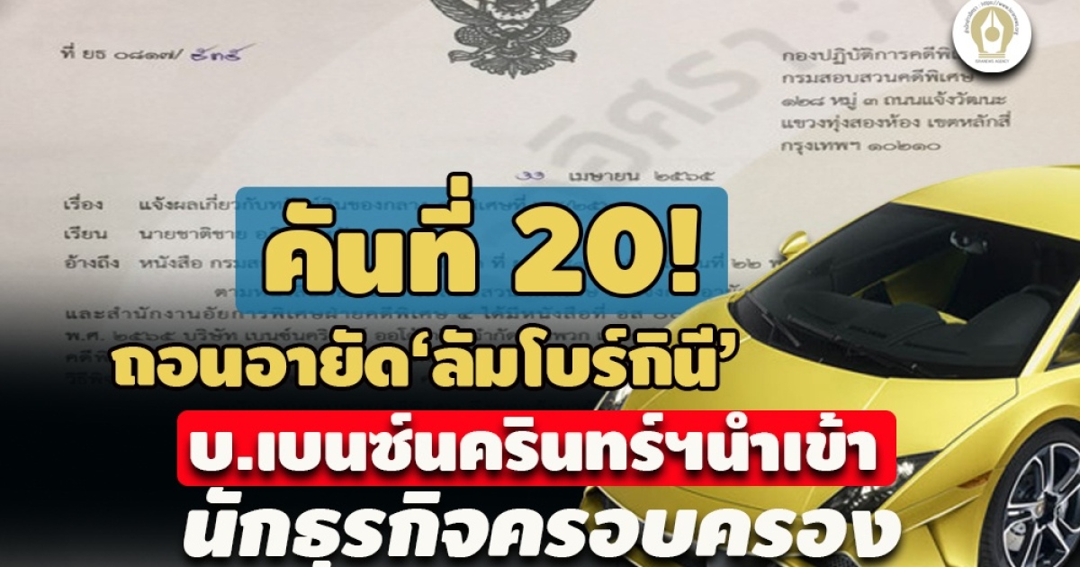 - เปิดหนังสือถอนอายัด ลัมโบร์กินี‘โดม ปกรณ์ ลัม’- บ.เบนซ์นครินทร์ฯ นำเข้า