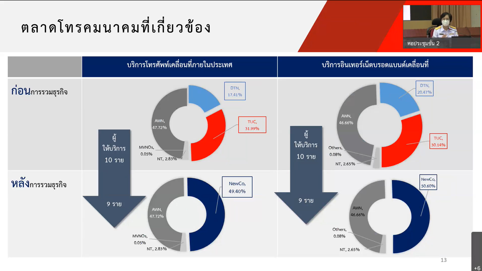 จิตสถา ให้ข้อมูลด้วยว่า การรวมธุรกิจระหว่าง TRUE และ DTAC จะทำให้จำนวนผู้เล่นในตลาดโทรคมนาคมลดลง โดยเฉพาะผู้ให้บริการโทรศัพท์เคลื่อนที่ภายในประเทศจะลดจาก 10 ราย เหลือ 9 ราย ขณะที่บริษัท NewCo ซึ่งเกิดการรวมธุรกิจระหว่าง TRUE และ DTAC จะมีส่วนแบ่งตลาด 49.40% และบริษัท แอดวานซ์ ไวร์เลส เน็ทเวอร์ค จํากัด (AWN) บริษัทลูกของ บมจ.แอดวานซ์ อินโฟร์ เซอร์วิส (ADVANC) หรือ AIS จะมีส่วนแบ่งตลาด 47.72%