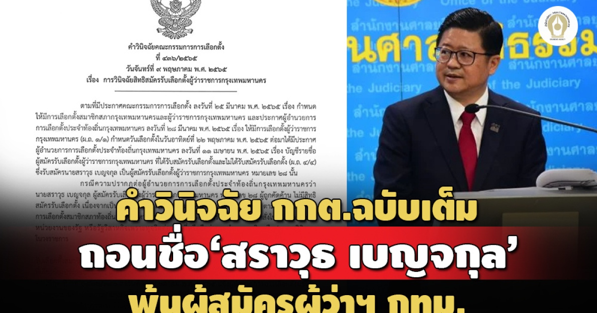 เห็นว่า ตามคำสั่งสำนักงานศาลยุติธรรมที่ 404/2565 สั่ง ณ วันที่ 22 เม.ย.2565 ไล่ผู้ถูกคัดค้านหรือนายสราวุธออกจากราชการเพราะผู้ถูกคัดค้านกระทำความผิดวินัยอย่างร้ายแรง ฐานทุจริตต่อหน้าที่ราชการและไม่ถือและปฏิบัติตาระเบียบแบบแผนและประเพณีปฏิบัติ่ของทางราชการและจริยธรรมของข้าราชการตุลาการ และการไม่ถือและปฏิบัตินั้นเป็นเหตุให้เสียหายแก่ราชการอย่างร้ายแรง ตาม พ.ร.บ.ระเบียบข้าราชการฝ่ายตุลาการศาลยุติธรรม พ.ศ.2543 มาตรา 77 (1) และ (3) ตั้งแต่วันที่ 30 มี.ค.2565 เป็นต้นไป อันเป็นระยะเวลาก่อนวันที่ผู้ถูกคัดค้านลงสมัครรับเลือกตั้งผู้ว่าฯ กทม.