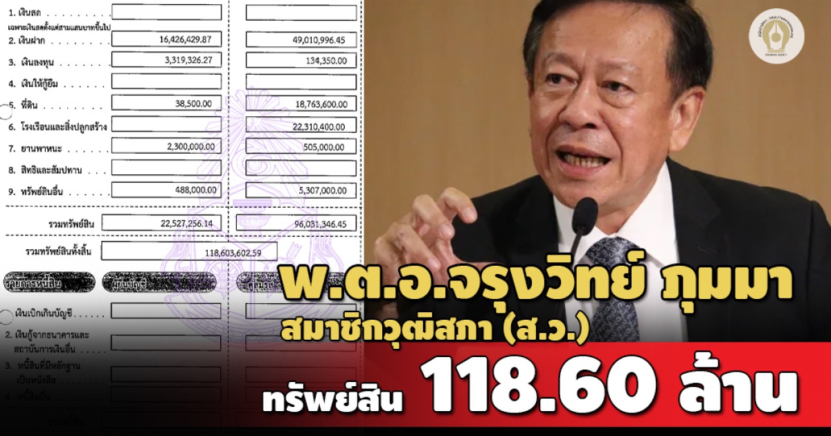 ทรัพย์สิน 118.60 ล้านบาท 'จรุงวิทย์ ภุมมา'อดีตเลขาฯ กกต.เข้ารับตำแหน่ง ส.ว. เงินฝาก 15 บัญชี 65.43 ล้านบาท ที่ดิน 10 แปลง 18.80 ล้านบาท สิ่งปลูกสร้าง 7 หลัง 22.31 ล้านบาท ภรรยาสะสม ทองรูปพรรณน้ำหนักรวม 80 บาท พระเครื่อง 13 องค์