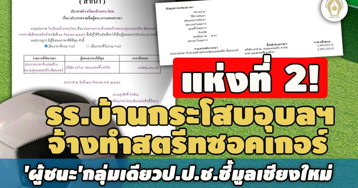 "...ล่าสุด สำนักข่าวอิศรา ตรวจสอบฐานข้อมูลจัดซื้อจัดจ้างภาครัฐพบว่า โรงเรียนบ้านกระโสบ(เพียรประสิทธิ์วิทยา) ตำบลกระโสบ อำเภอเมืองอุบลราชธานี จังหวัดอุบลราชธานี เป็นหน่วยงานราชการอีกแห่ง นอกจาก องค์การบริหารส่วนตำบล (อบต.) ตาลโกน อำเภอสว่างแดนดิน จังหวัดสกลนคร ที่ทำสัญญา จ้าง บริษัท อาร์.เค. คอนแทรคติ้ง จำกัด ซึ่งเป็นกลุ่มเอกชนที่ถูกป.ป.ช.ชี้มูลความผิดการดำเนินงานโครงการในพื้นที่จังหวัดเชียงใหม่ เข้ามารับงานก่อสร้างสนามฟุตบอลสตรีท ซ็อคเกอร์ ด้วย ..."