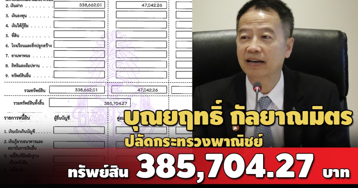'บุณยฤทธิ์ กัลยาณมิตร' นั่งปลัดกระทรวงพาณิชย์ ครบ 3 ปี แจ้ง ป.ป.ช.มีทรัพย์สิน รวม 385,704.25 บาท เป็นเงินฝาก 3 บัญชี รายได้ต่อปี 1.42 ล้านบาท จากเงินเดือน-เงินประจำตำแหน่ง ขณะที่คู่สมรสไม่มีรายได้