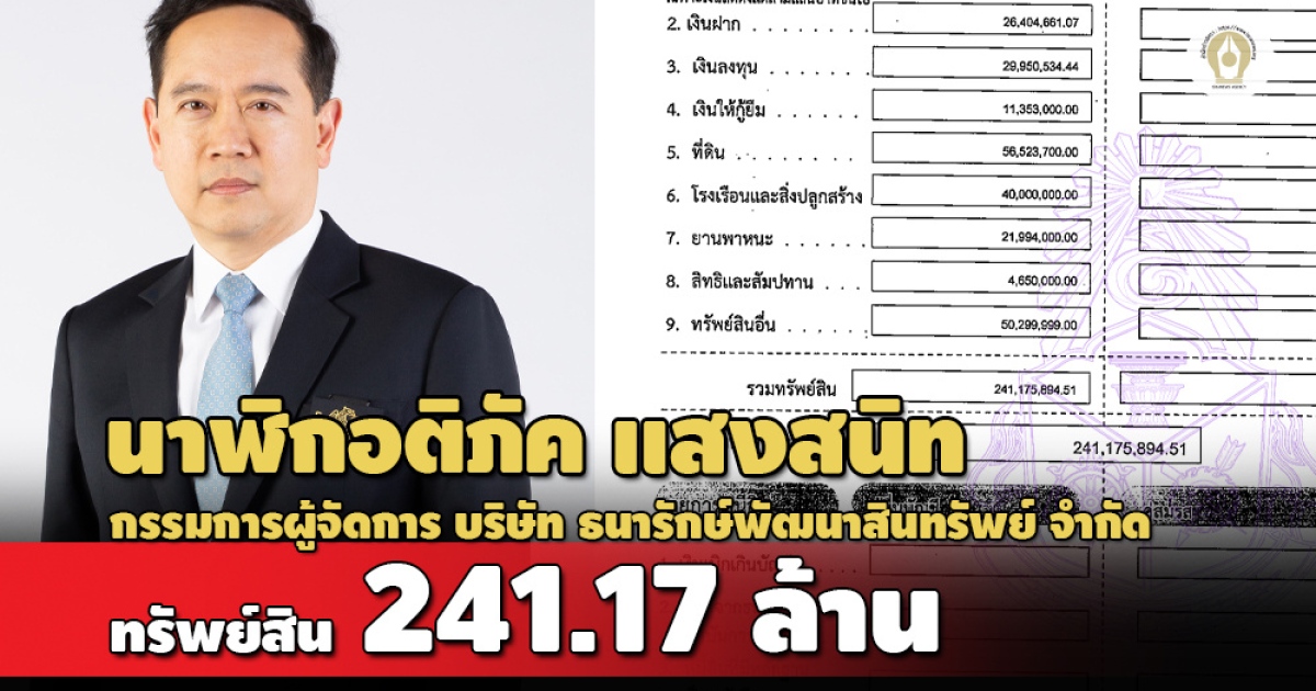 นายนาฬิกอติภัค แสงสนิท อายุ 56 ปี แจ้งมีทรัพย์สิน รวม 241,175,894.51 บาท ไม่มีหนี้สิน