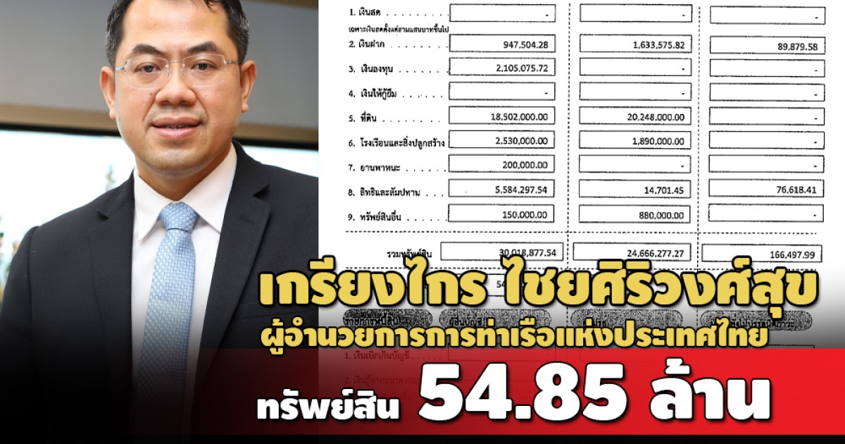 ทรัพย์สิน 54.85 ล้านบาท 'เกรียงไกร ไชยศิริวงศ์สุข' นั่ง ผอ.การท่าเรือฯ ที่ดิน 12 แปลง 38.75 ล้านบาท บ้าน 4 หลัง 4.42 ล้านบาท รายได้ต่อปี 4.25 ล้านบาทจากเงินเดือน โบนัส เบี้ยประชุม