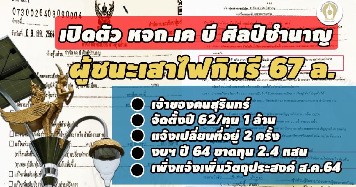 จากการตรวจสอบเอกสารจดทะเบียนตั้ง หจก. เค บี ศิลป์ชำนาญ พบว่า นายสุระศักดิ์ สาแก้ว เจ้าของเป็นชาวสุรินทร์ อยู่ในตำบลหนองบัว อำเภอท่าตูม จังหวัดสุรินทร์