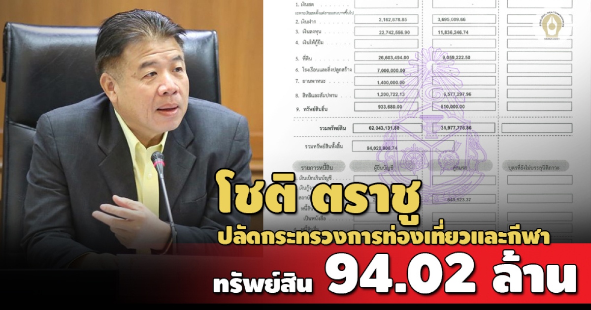 ทรัพย์สิน 94.02 ล้านบาท 'โชติ ตราชู' นั่งปลัดกระทรวงการท่องเที่ยวและกีฬา ครบ 3 ปี เงินลงทุน 33 รายการ 34.57 ล้านบาท ที่ดิน-บ้าน 42.66 ล้านบาท สะสมนาฬิกาหรู - ปืน