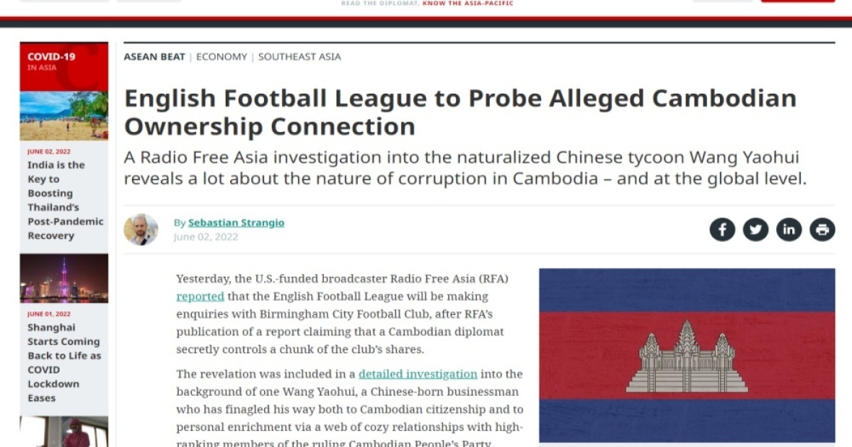 เรียบเรียงจาก:https://thediplomat.com/2022/06/english-football-league-to-probe-alleged-cambodian-ownership-connection/,https://www.rfa.org/english/news/cambodia/cambodia-wang-yaohui-05202022172549.html?fbclid=IwAR0onthRcXJcmmJot-Q1nOX6MaUg_1ubox1MwMRCLndhYeVHDwZhEOZ_2p8