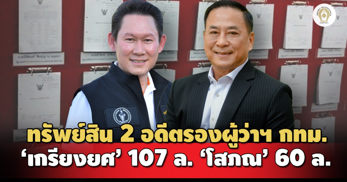 ทรัพย์สิน 2 รองผู้ว่าฯ ยุค ‘อัศวิน ขวัญเมือง’ หลังพ้นตำแหน่ง ‘เกรียงยศ ’ 107.04 ล้านบาท ที่ดิน 20 แปลง บ้านเดี่ยว 2 หลัง รวม 88.26 ล้านบาท สะสมนาฬิกาหรู 5 เรือน 4.45 ล้านบาท ‘โสภณ’ 60.74 ล.สะสมปืน 5 กระบอก นาฬิกาหรู พระเครื่องเพียบ แจ้งโอนบ้าน-ที่ดินให้ลูก รวม 14 รายการ