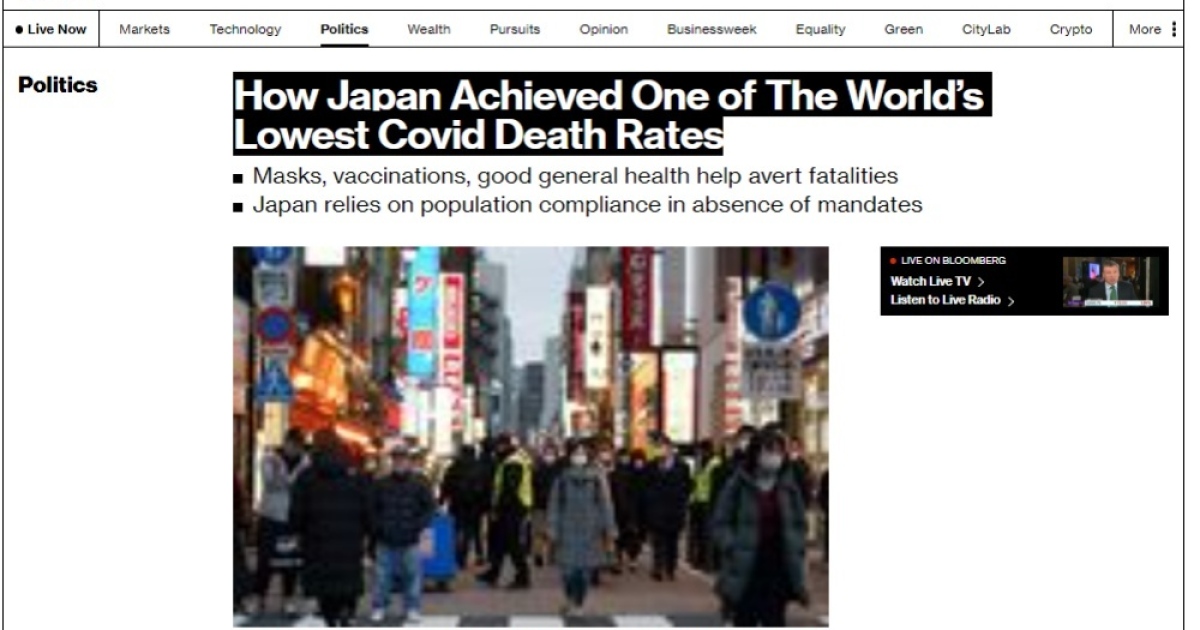 ล่าสุดสำนักข่าวบลูมเบิร์กของสหรัฐอเมริกา ได้มีการเขียนบทวิเคราะห์ฉบับหนึ่งเอาไว้ว่าในบรรดาประเทศที่พัฒนาแล้วทั่วโลกนั้น ประเทศญี่ปุ่นถือว่ามีอัตราการเสียชีวิตจากโควิด-19 น้อยที่สุดในโลกเมื่อเทียบต่อสัดส่วนประชากร
