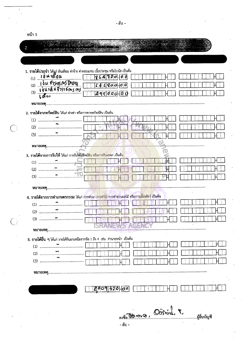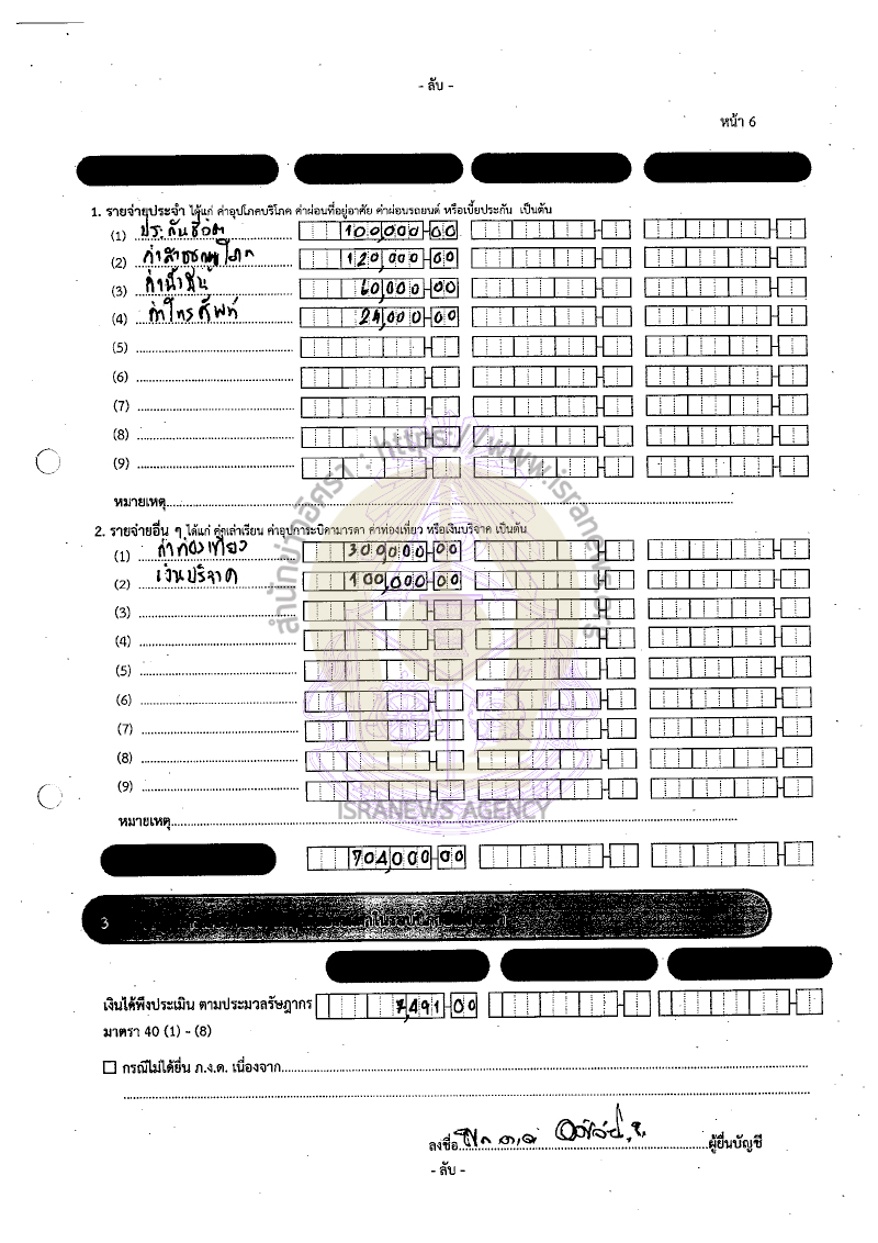 แจ้งมีรายจ่าย 704,000 บาท จากประกันชีวิต 100,000 บาท ค่าสาธารณูปโภค 120,000 บาท ค่าน้ำมัน 60,000 บาท ค่าโทรศัพท์ 24,000 บาท ค่าท่องเที่ยว 300,000 บาท เงินบริจาค 100,000 บาท