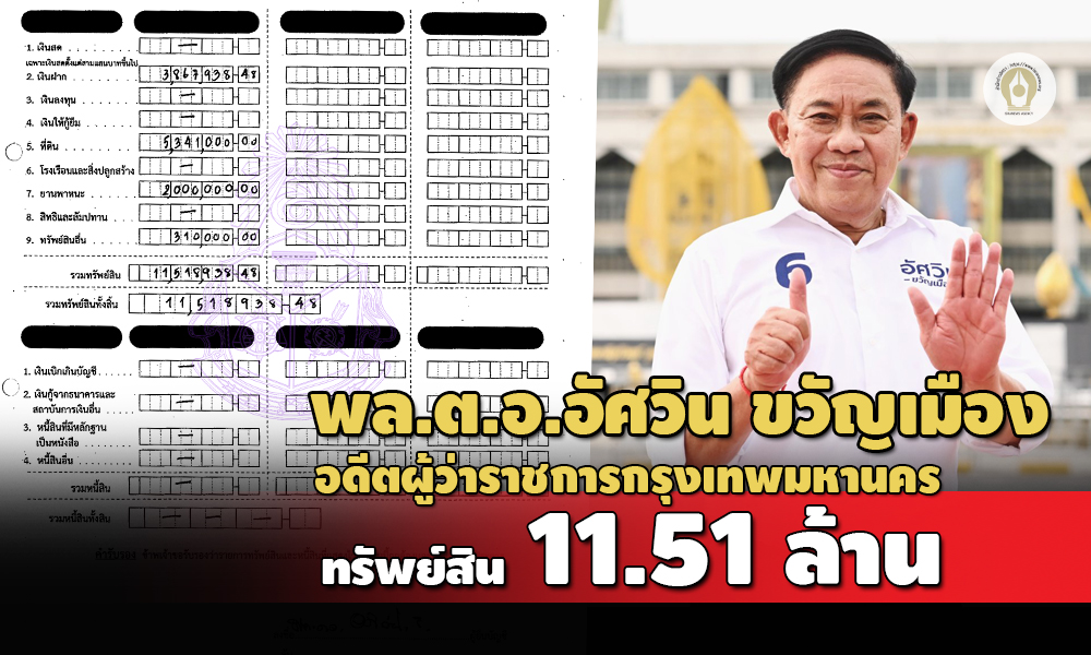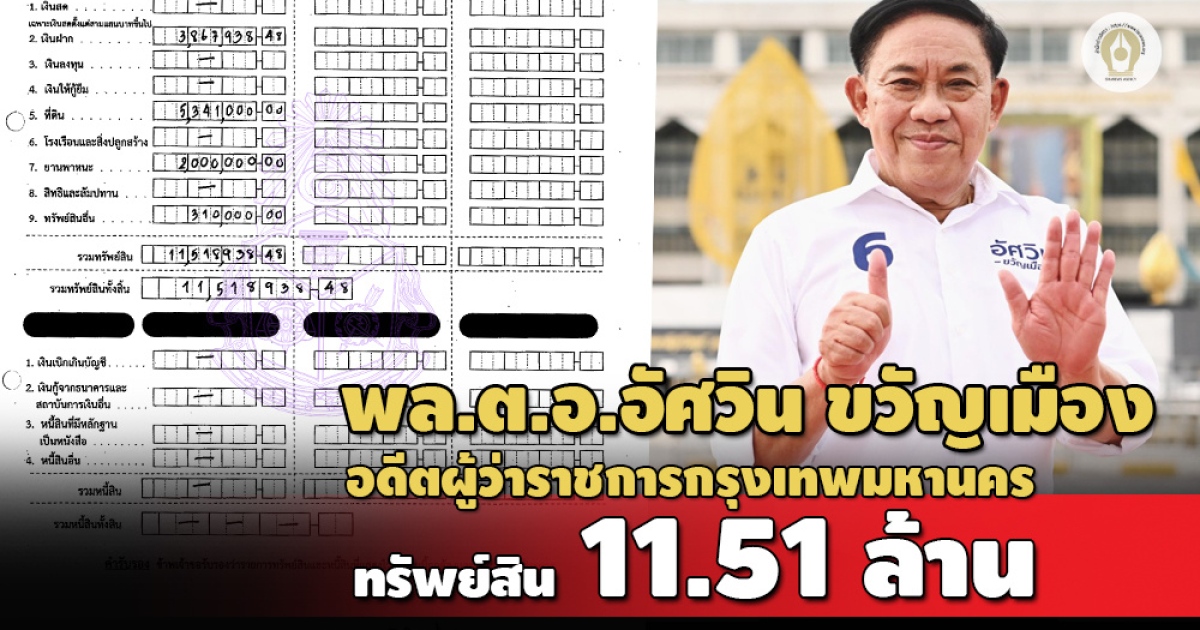 ทรัพย์สิน 11.51 ล.‘อัศวิน ขวัญเมือง’พ้นผู้ว่าฯ กทม.เงินฝาก 4 บัญชี 3.86 ล้านบาท ที่ดิน 6 แปลงที่ชลบุรี-นครปฐม 5.34 ล้านบาท แจ้งรายได้ต่อปี 2 ล้านบาทจากเงินเดือน-บำนาญ