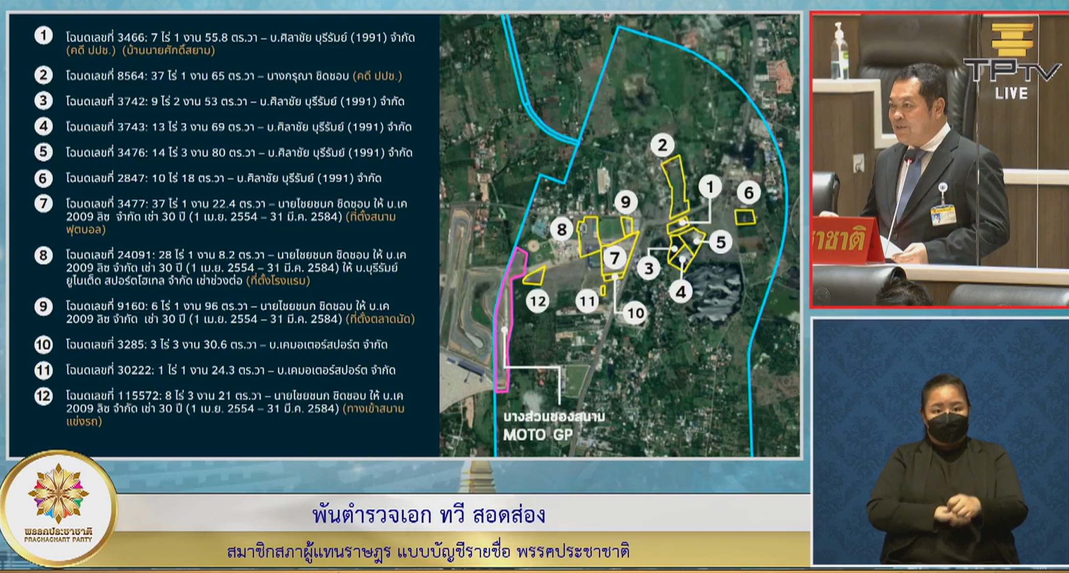 12.โฉนดเลขที่ 115572 เนื้อที่ 8 โร่ 3 งาน 21 ตารางวา ถือครองโดย นายไชยชนก ชิดชอบ และให้ บริษัท เค 2009 ลิซ จำกัด เช่า 30 ปี (1 เม.ย. 2554-31 มี.ค. 2584) (ทางเข้าสนามแข่งรถ)