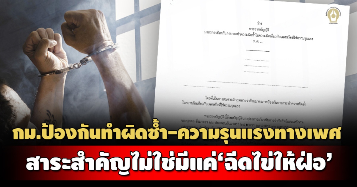 ร่าง พ.ร.บ.ป้องกันการทำผิดซ้ำฯ หัวใจสำคัญคือการอุดช่องว่าง ก่อนการปล่อยตัวนักโทษกลับสู่สังคม เพื่อป้องกันไม่ให้ออกมาทำผิดซ้ำอีก เป็นการเพิ่มความปลอดภัยให้สังคมมากขึ้น และไม่ได้มีแค่เรื่อง ‘ฉีดให้ฝ่อ’ อย่างที่หลายคนเข้าใจ