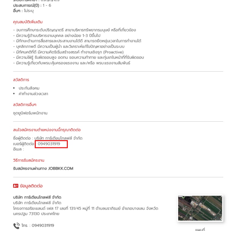 ส่วนข้อมูลของเบอร์โทรติดต่อของผู้ที่ขายสินค้าที่ระบุในแคชของเฟซบุ๊กของบริษัทโกลด์ ซัพพลาย เมด ตรงกับเบอร์โทรของ HR บนเว็บรับสมัครงานของบริษัทการ์เดียน โกลฟส์ ด้วยเช่นกัน (ดูภาพประกอบ)