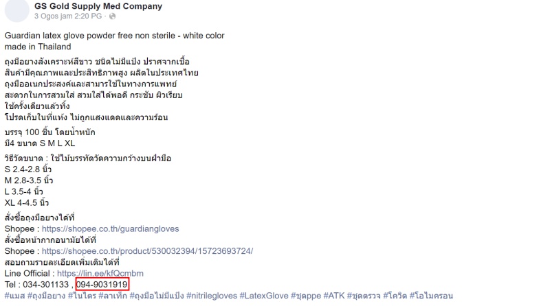 ทั้งนี้ จากการตรวจสอบข้อมูลในเฟซบุ๊กของบริษัทโกลด์ ซัพพลาย เมด พบว่าถูกปิดไปแล้ว อย่างไรก็ดี จากการตรวจสอบแคชของเว็บไซต์ พบว่าบริษัทโกลด์ซัพพลายเมด เคยโพสต์ลิงค์ไปถึงเว็บขายของ Shoppee ซึ่งปรากฎว่าเป็นร้านขายของลงชื่อว่า Guardiangloves หรือการ์เดียนโกลฟส์