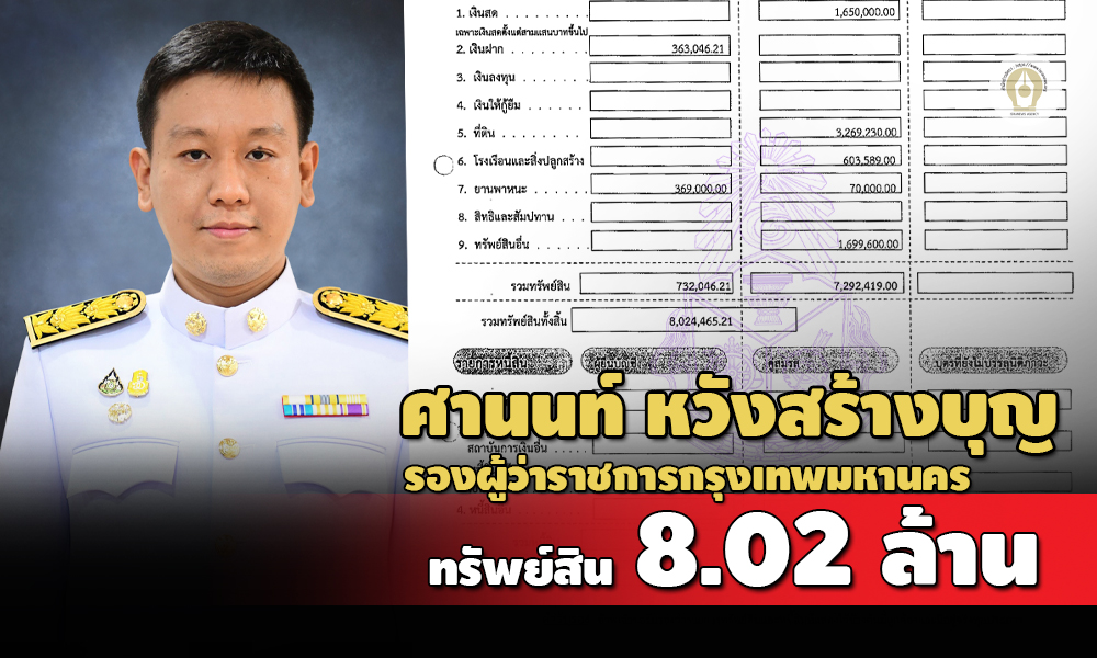 ทรัพย์สิน 8.02 ล้านบาท 'ศานนท์ หวังสร้างบุญ' นั่งรองผู้ว่าฯ กทม. ส่วนตัวมีเงินฝาก 3.63 แสนบาท รถยนต์ 1 คัน เพิ่งแต่งงานปี 63 ภรรยาเจ้าของภูเรือเรือนไม้รีสอร์ท - สวนเกษตรอินทรีพย์ บ้านเพียงพอสุข จ.เลย
