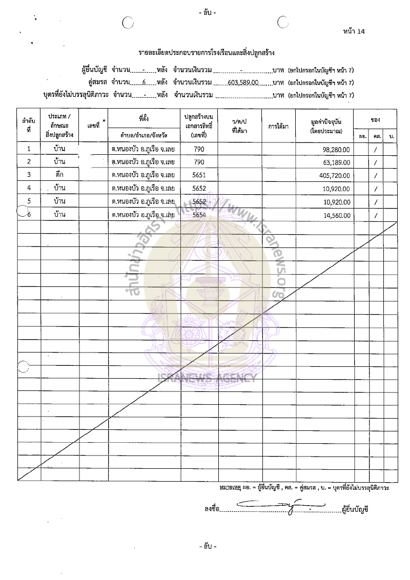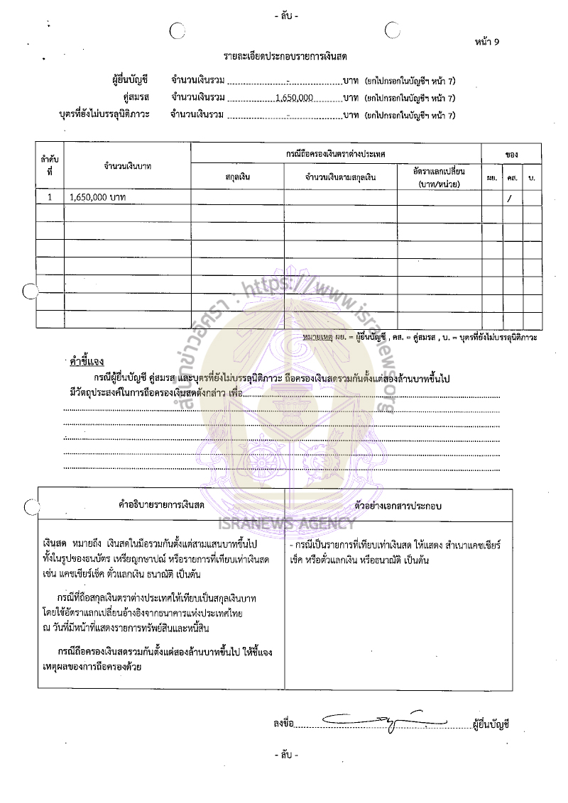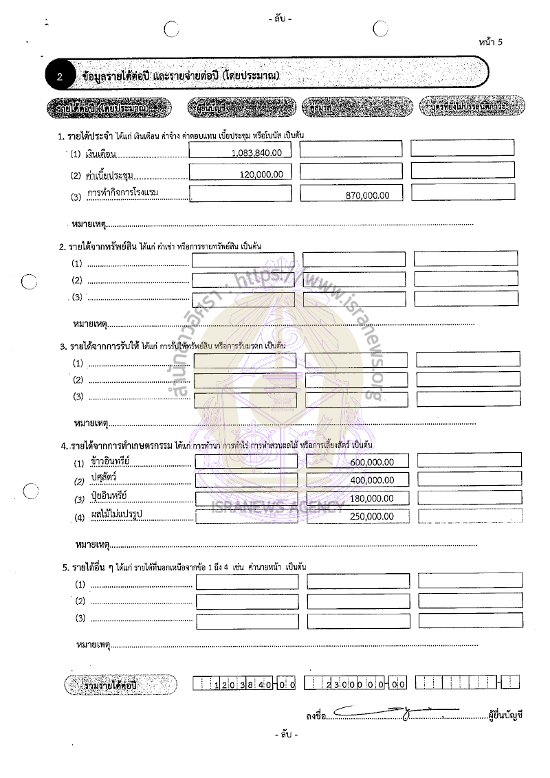 คู่สมรส แจ้งมีรายได้ต่อปี 2,300,000 บาท จากการทำกิจการโรงแรม 870,000 บาท ข้าวอินทรีย์ 600,000 บาท ปศุสัตว์ 400,000 บาท ปุ๋ยอินทรีย์ 180,000 บาท ผลไม้ไม่แปรรูป 250,000 บาท