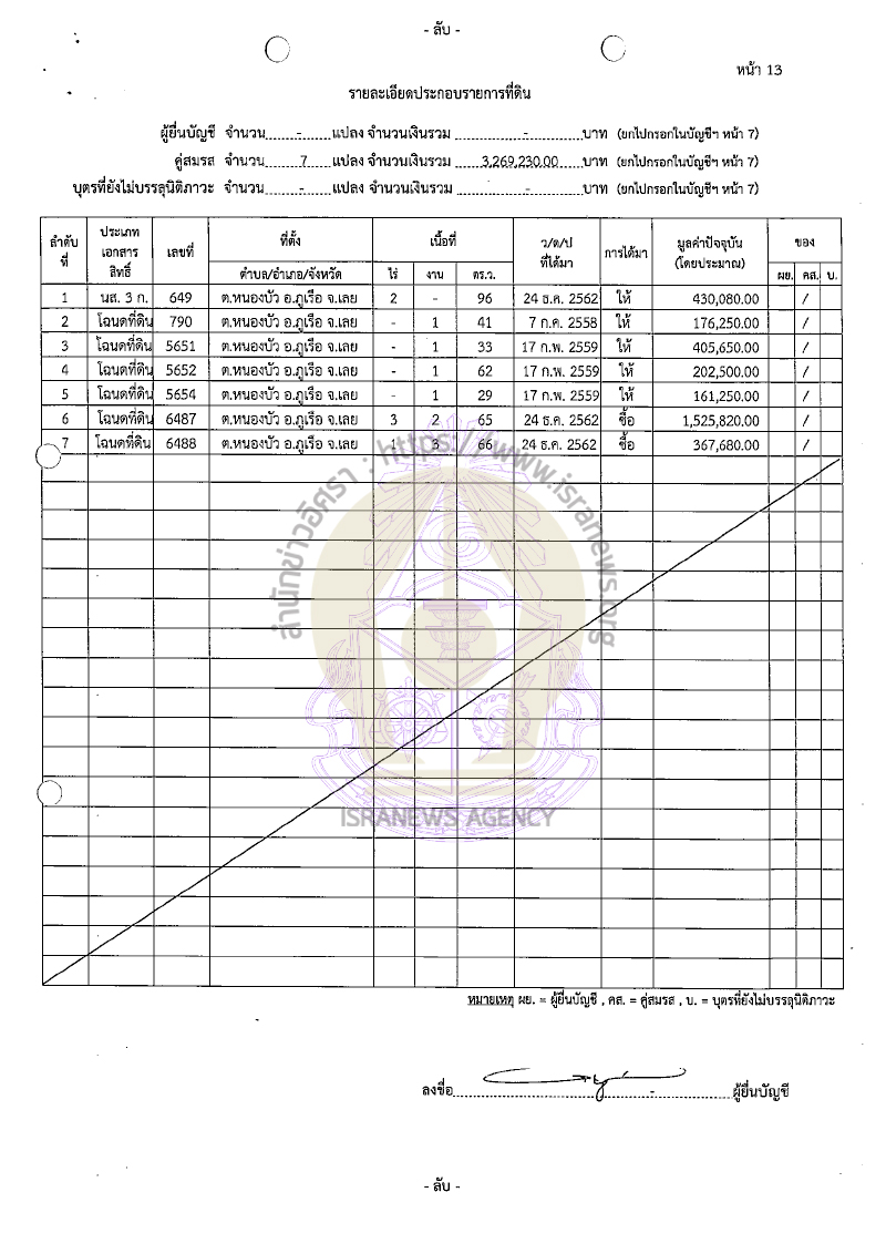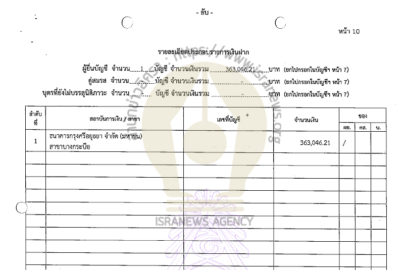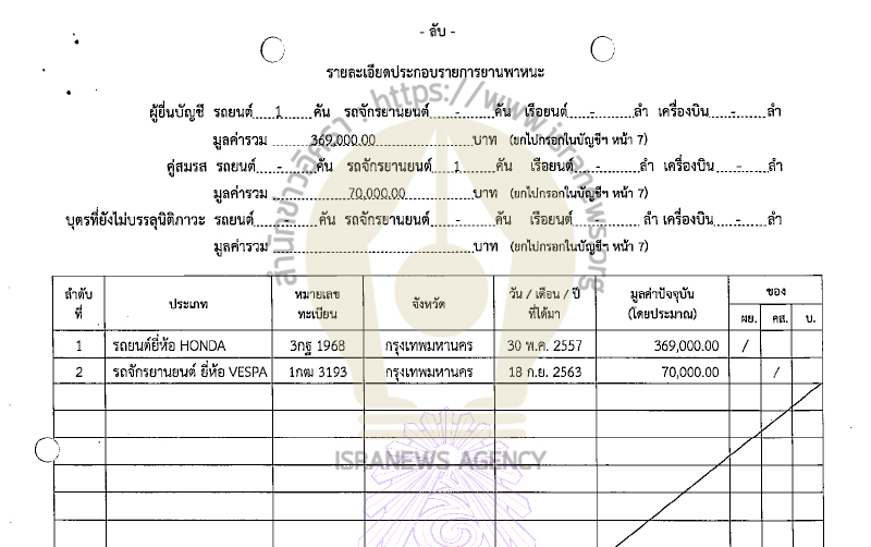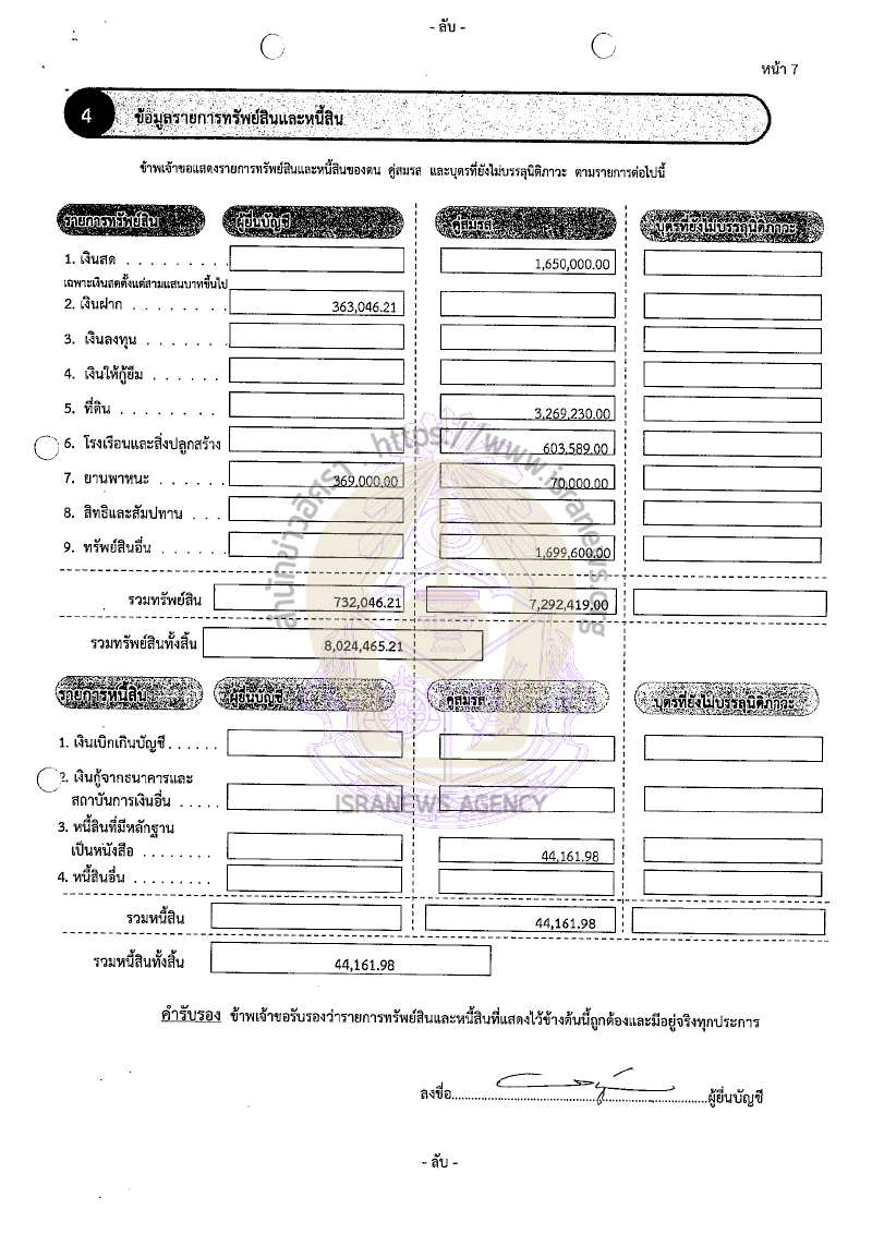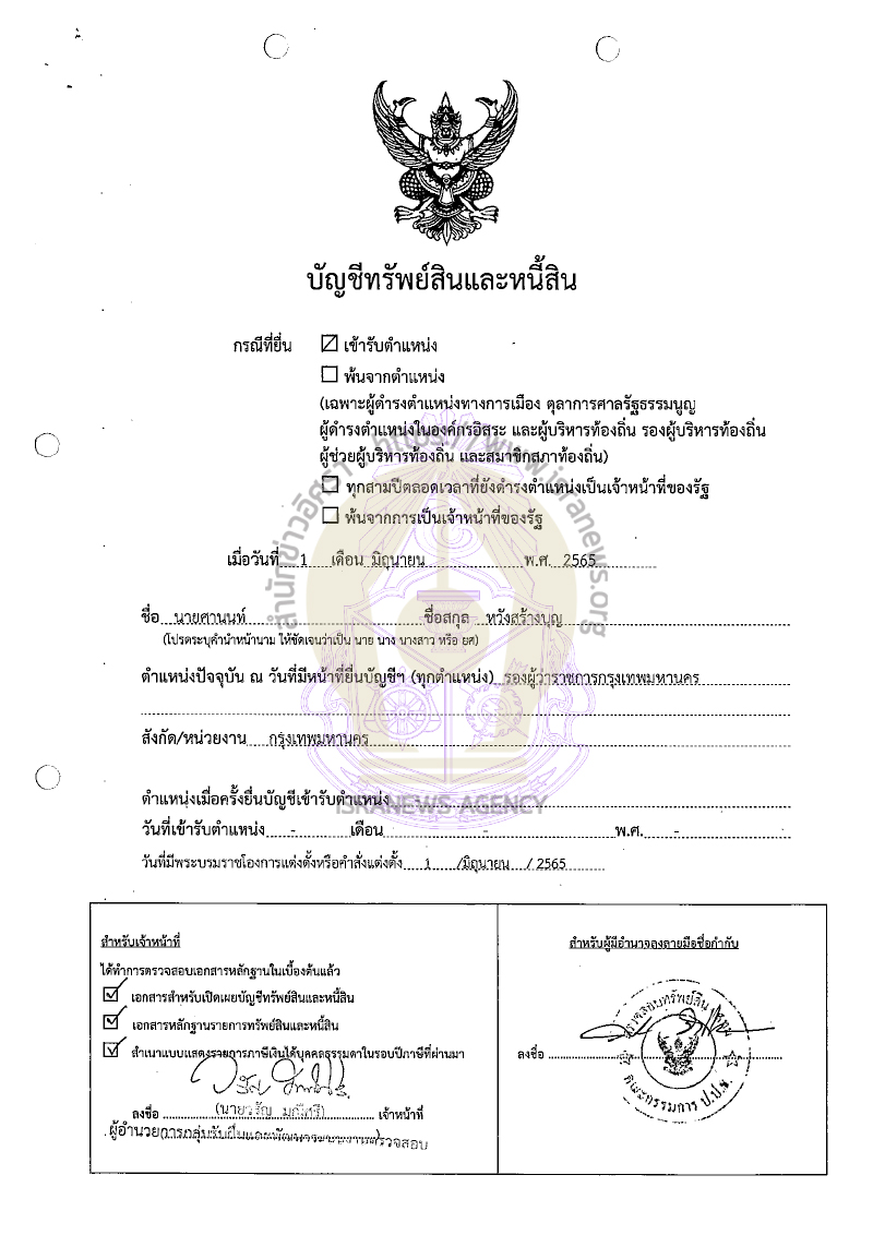 นายศานนท์ หวังสร้างบุญ อายุ 33 ปี แจ้งมีทรัพย์สิน 732,046.21 บาทจากเงินฝาก (1 บัญชี) 363,0046.21 บาท ยานพาหนะ (รถยนต์ HONDA 1 คัน) 369,000 บาท