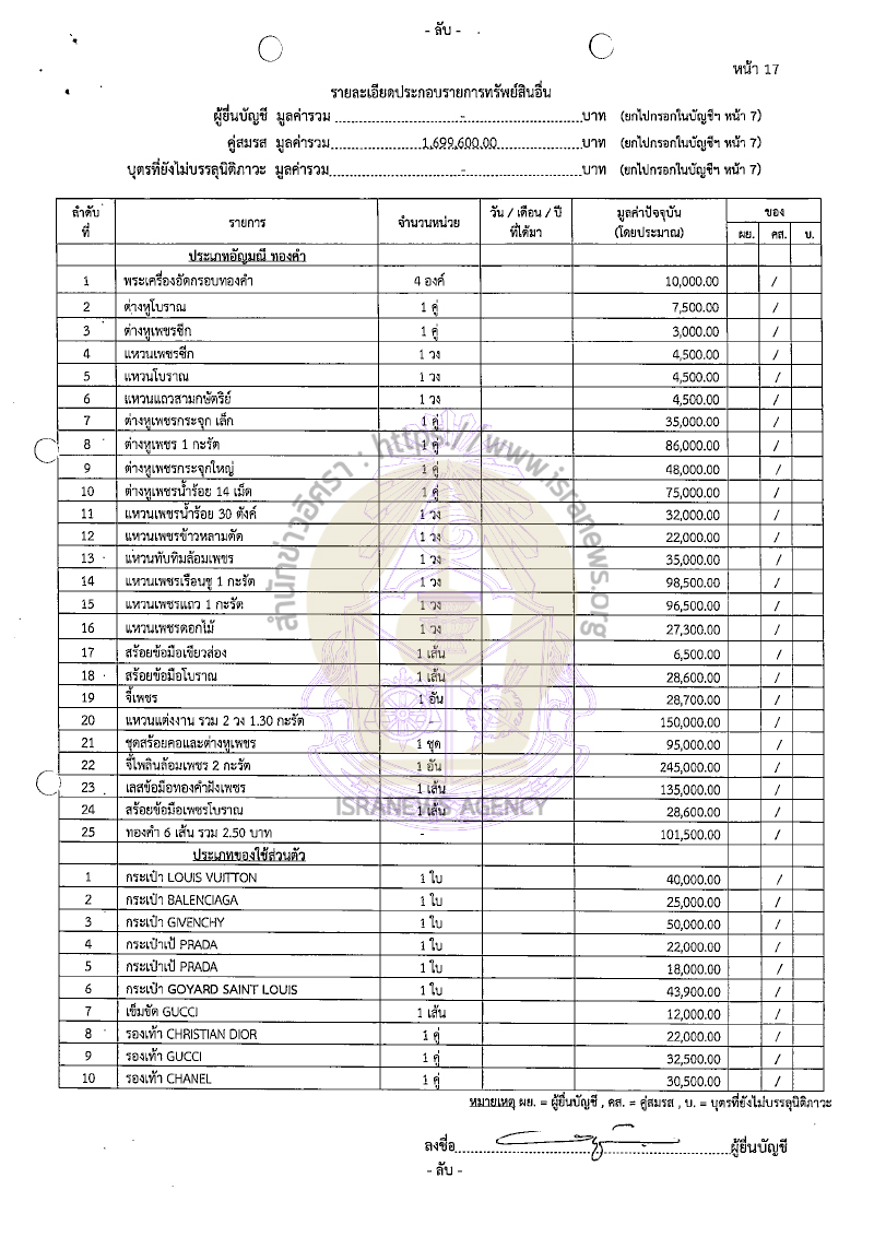ทรัพย์สินที่น่าสนใจ น.ส.จิตชนก แจ้งมีกระเป๋าแบรนด์เนม 6 ใบ เข็มขัด 1 เส้น รองเท้า 3 คู่ เครื่องประดับหลายรายการ