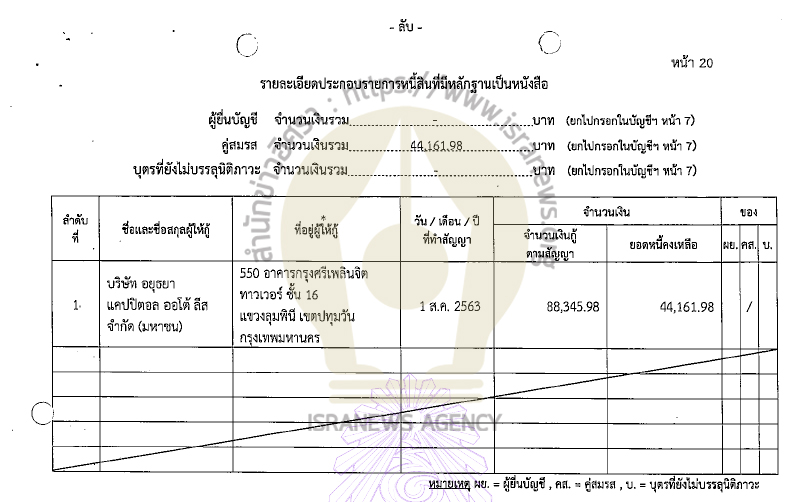 แจ้งมีรายจ่าย 1,586,002 บาท จากค่าอุปโภคบริโภค 100,000 บาท ค่าใช้จ่ายส่วนตัว 180,000 บาท ค่าผ่อนเงินกู้ธนาคาร 1,091,200 บาท ค่าเบี้ยประกัน 58,754 บาท ค่าสาธารณูปโภค 130,800 บาท ค่าผ่อนรถจักรยานยนต์ 25,248 บาท