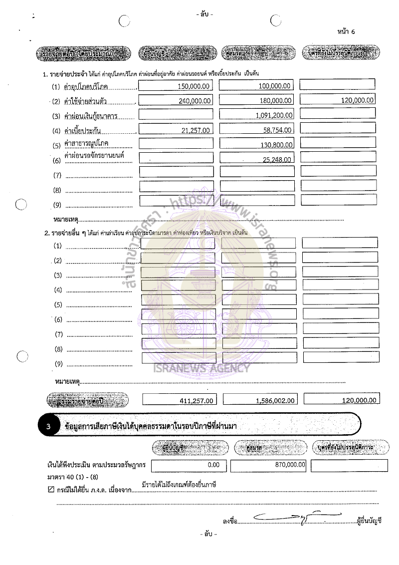 แจ้งมีรายจ่าย 411,257 บาทจากค่าอุปโภคบริโภค 150,000 บาท ค่าใช้จ่ายส่วนตัว 240,000 บาท ค่าเบี้ยประกัน 21,257 บาท