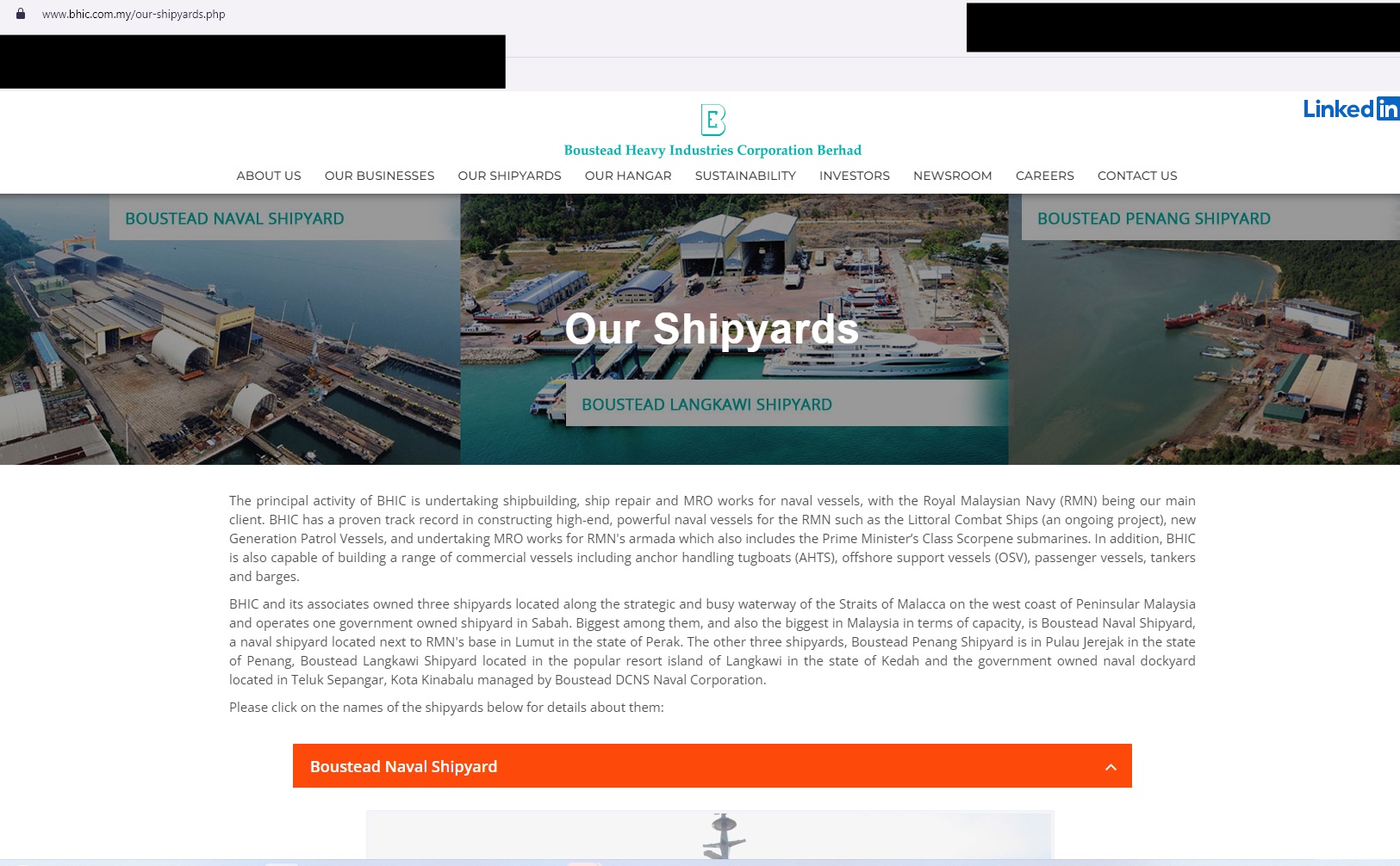 โดยบริษัทบูสเตด โฮลดิ้งส์ แห่งนี้นั้นระบุว่าตัวเองเป็นบริษัทศูนย์กลางครบวงจรสำหรับด้านการป้องกันประเทศที่กองทัพเรือต้องการ สำหรับที่ตั้งของบริษัทแห่งนี้นั้นพบว่าอยู่ที่ฐานทัพหลักของกองทัพเรือมาเลเซียในเมืองลูมุต ในรัฐเปรัคของมาเลเซีย