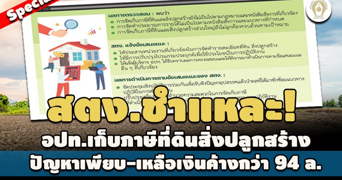 "...ในการส่วนการจัดเก็บภาษีที่ดินและสิ่งปลูกสร้างส่วนใหญ่ยังไม่ถูกต้องครบถ้วนตามเป้าหมาย นั้น จากการตรวจสอบ เพียงวันที่ 31 สิงหาคม 2563.. พบ ว่า อปท.สามารถจัดเก็บภาษีได้ จำนวน 93,387 ราย เป็นเงินจำนวน 186.59 ล้านบาท มีการจัดเก็บภาษีได้ (ต่ำ) กว่าที่แจ้งประเมินภาษี จำนวน 74,795 ราย คงเหลือภาษีที่ยังไม่ได้จัดเก็บ จำนวน 94.83 ล้านบาท ..."
