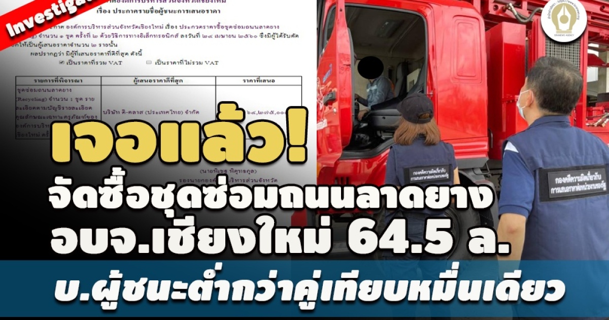พบข้อมูล 1 ใน 2 โครงการ จัดซื้อชุดซ่อมถนนลาดยาง (Recycling) อบจ.เชียงใหม่ ก่อนดีเอสไอสอบฮั้ว เสียหาย 124 ล. พบรายการแรก งบฯ 64.5 ล. ไส้ในประกวดราคาเอกชนซื้อซอง 5 เสนอราคา 2 ราย บ.ผู้ชนะห่างจากคู่เทียบ 10,000 บาท ทำสัญญาเรียบร้อย 14 มิ.ย. 2560