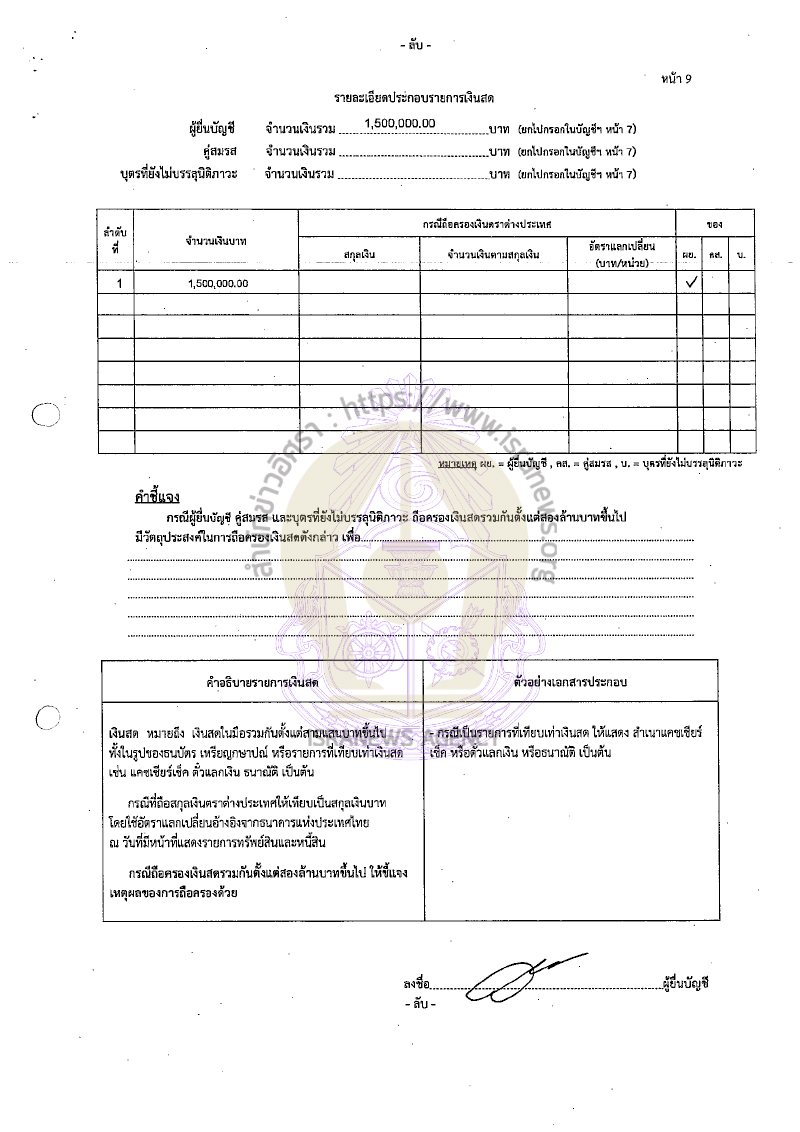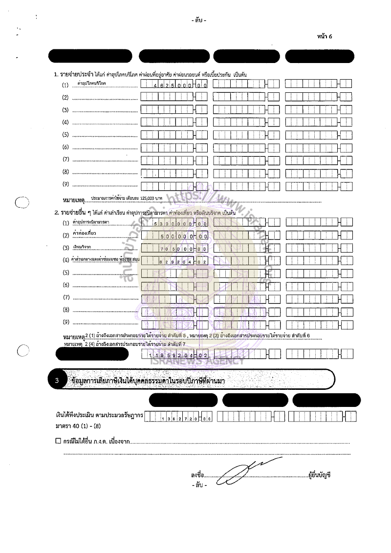 แจ้งมีรายจ่าย 11,959,204.02 บาท จากค่าอุปโภคบริโภค 4,625,000 บาท ค่าอุปการะบิดามารดา 5,300,000 บาท ค่าท่องเที่ยว 500,000 บาท เงินบริจาค 705,000 บาท ค่าส่วนกลางและค่าซ่อมแซม ห้องชุด 829,204.02 บาท