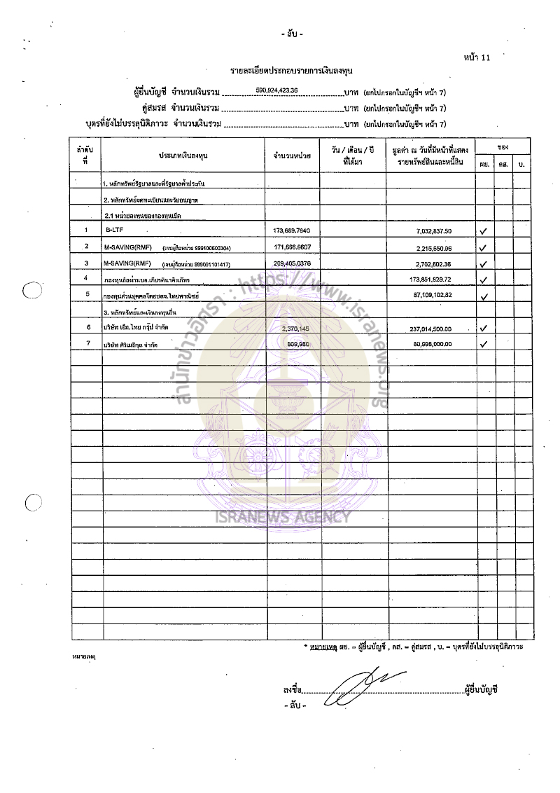 จากการตรวจสอบรายละเอียด พบว่า เงินลงทุน 7 รายการ 590,924,423.35 บาท แบ่งเป็นเงินลงทุนในกองทุน 5 รายการ และยังมีกรลงทุนในบริษัท 2 แห่ง คือ บริษัท เอ็ม.ไทย กรุ๊ป จำกัด มูลค่า 237,014,500 บาท บริษัท ศิริเมธีกุล จำกัด 80,998,000 บาท