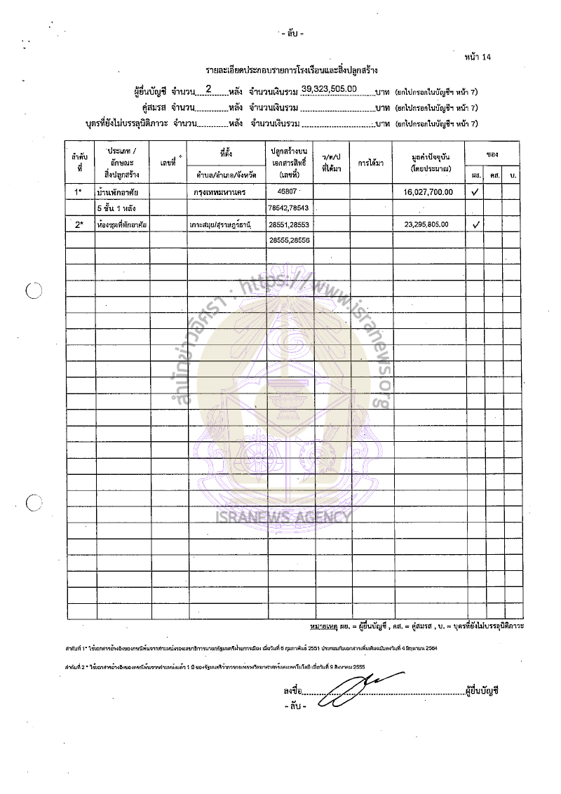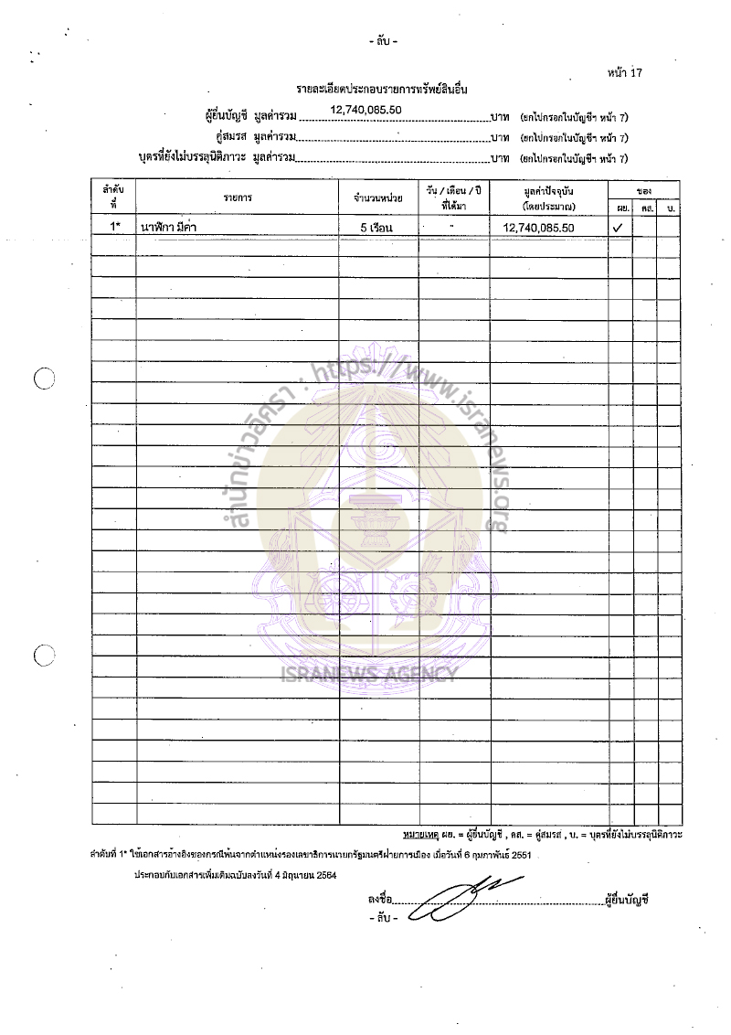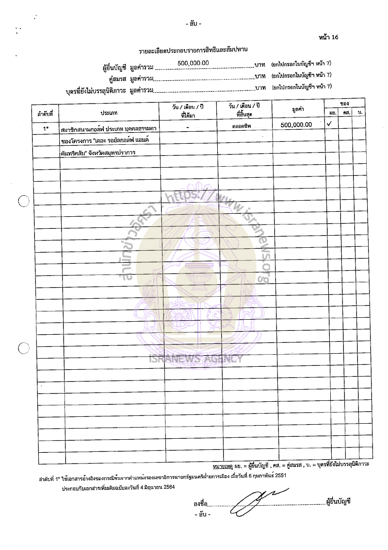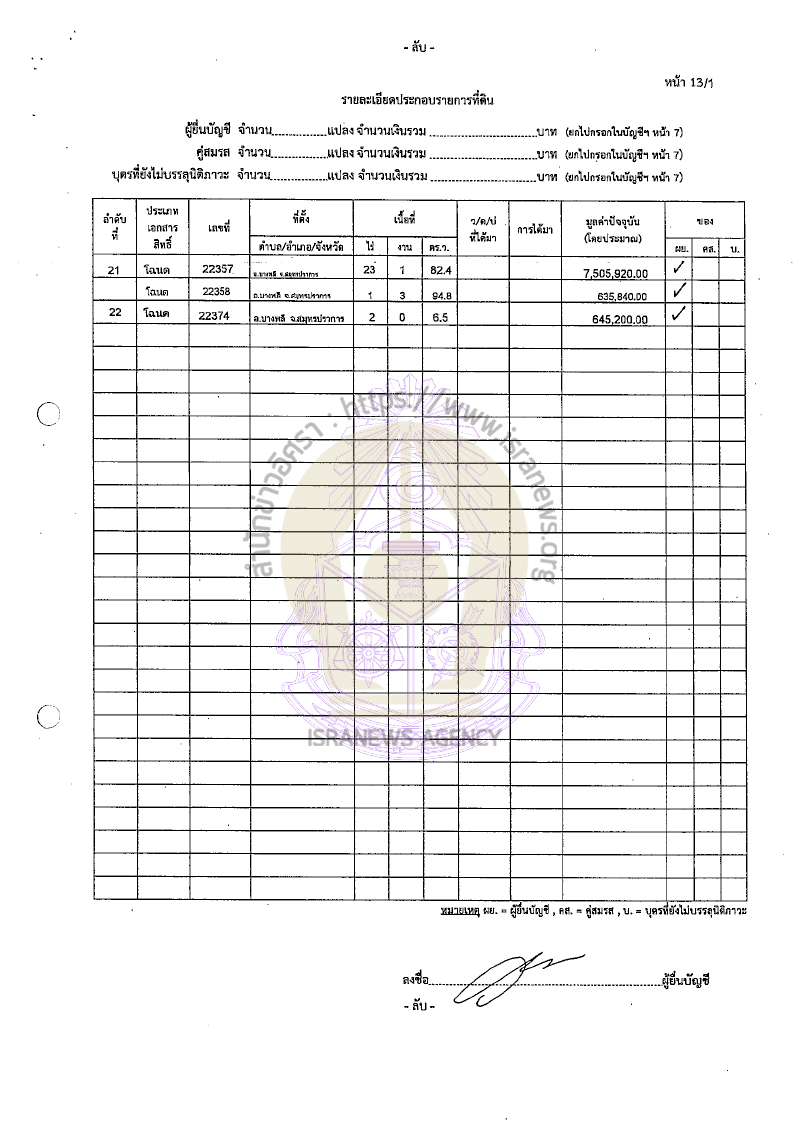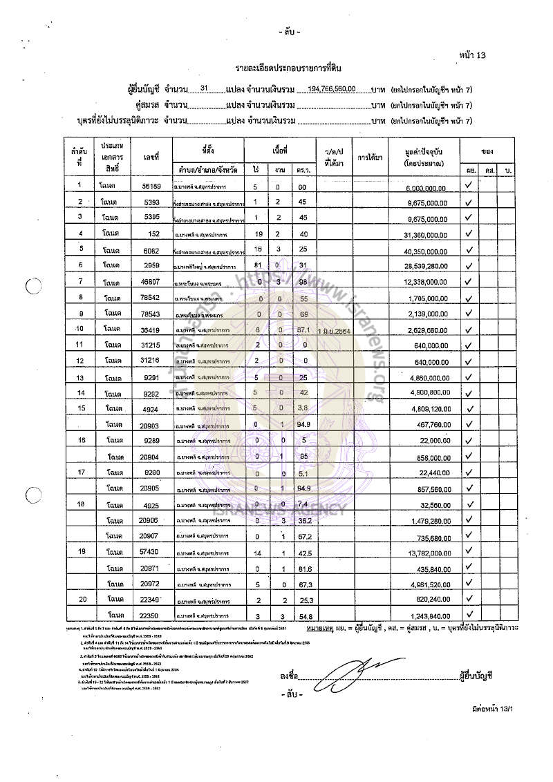 ขณะที่รายการที่ดิน แจ้งมี 31 แปลง 194,766,560 บาท เนื้อที่รวม 210-2-226.8 ไร่ แบ่งเป็น. จ.สมุทรปราการ (ส่วนใหญ่อยู่ใน อ.บางพลี) 28 แปลง และอีก 3 แปลง ระบุว่าอยู่ใน อ.พระโขนง จ.พระนคร