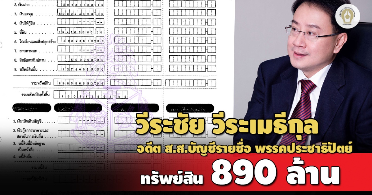 ทรัพย์สิน 890.58 ล้านบาท 'วีระชัย วีระเมธีกุล' เงินลงทุน 590.92 ล้านบาท ที่ดิน 210 ไร่ 194.76 ล้านบาท ส่วนใหญ่อยู่ใน จ.สมุทรปราการ มีรายได้ 75.13 ล้านบาทจากเงินปันผล-ขายที่ดิน