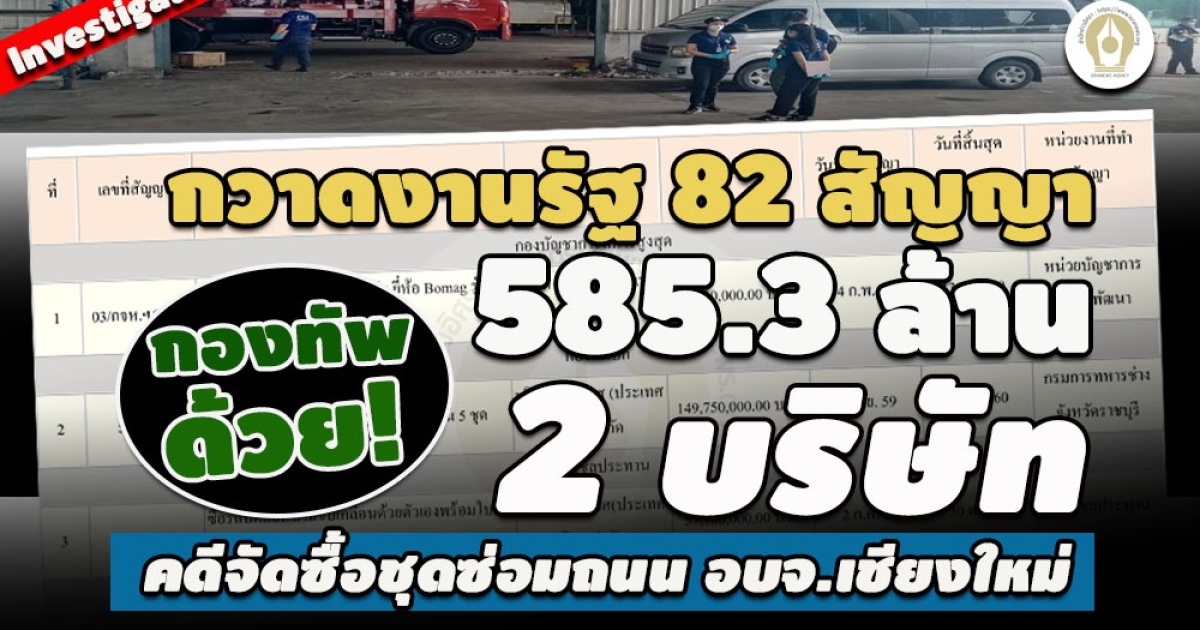 พบ 2 บ.ดี-คลาส ฯ - แซลมอน ดริลลิ่ง คดีจัดซื้อชุดซ่อมถนนลาดยาง อบจ.เชียงใหม่ 128 ล. เป็นคู่สัญญาหน่วยงานรัฐ 82 โครงการ 585.37 ล. รถบดล้อยาง หน่วยฯทหารพัฒนา - กรมชลประทาน - ชุดขุดเจาะน้ำบาดาล กรมการทหารช่าง ราชบุรี รถบรรทุกเก็บขยะ องค์กรปกครองท้องถิ่นนับสิบแห่ง