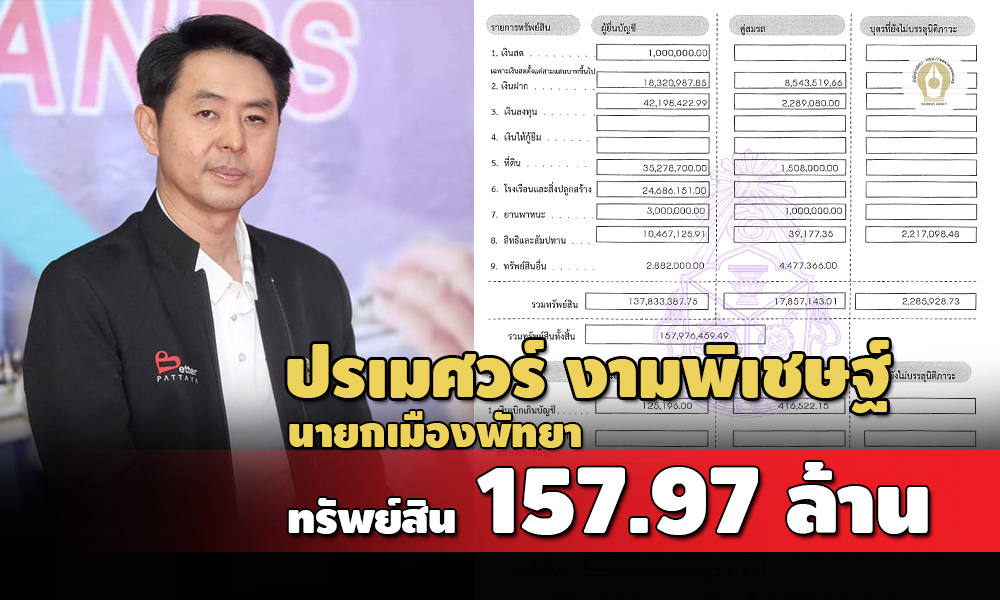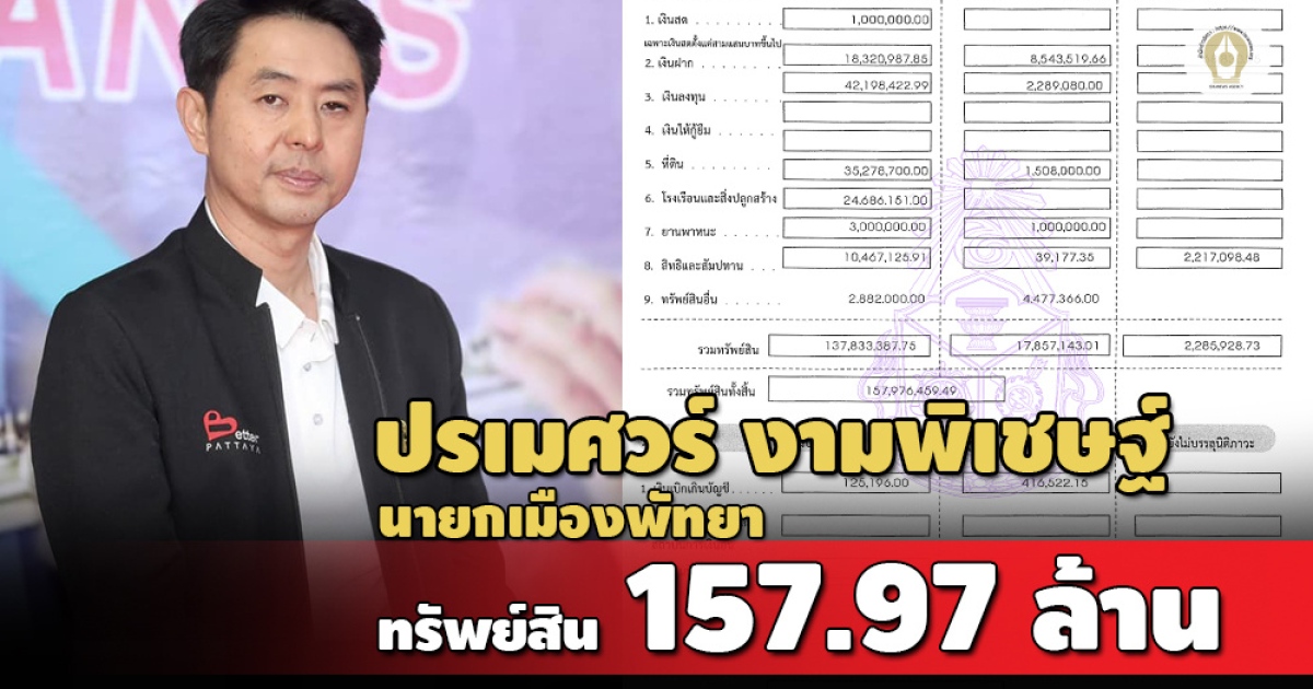 ทรัพย์สินอื่น 157.97 ล้านบาท 'ปรเมศวร์ งามพิเชษฐ์' นายกเมืองพัทยา เงินลงทุน 12 รายการ 44.48 ล้านบาท ที่ดิน 11 แปลง 36.78 ล้านบาท แจ้งมีรายได้ 15.25 ล้านบาท เป็นเงินมรดก 12.44 ล้านบาท