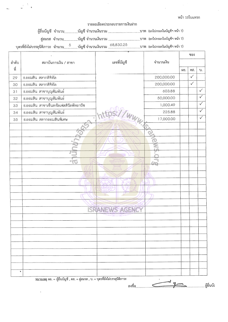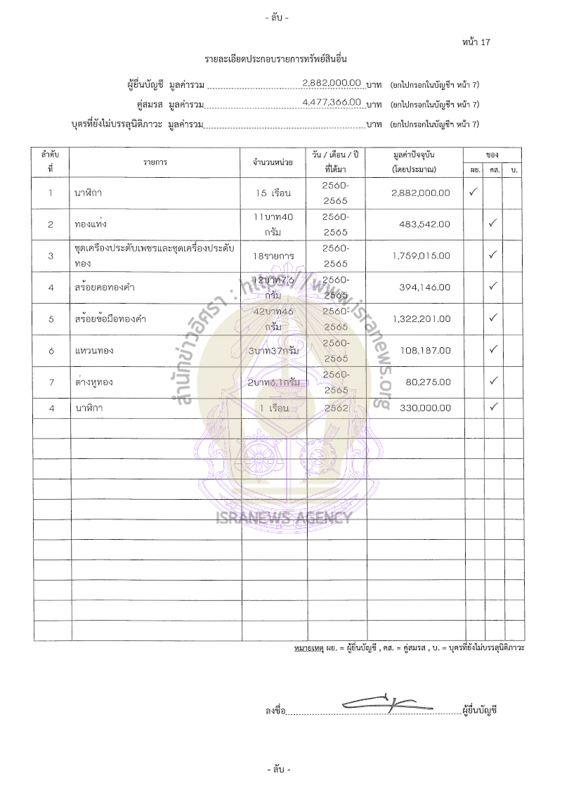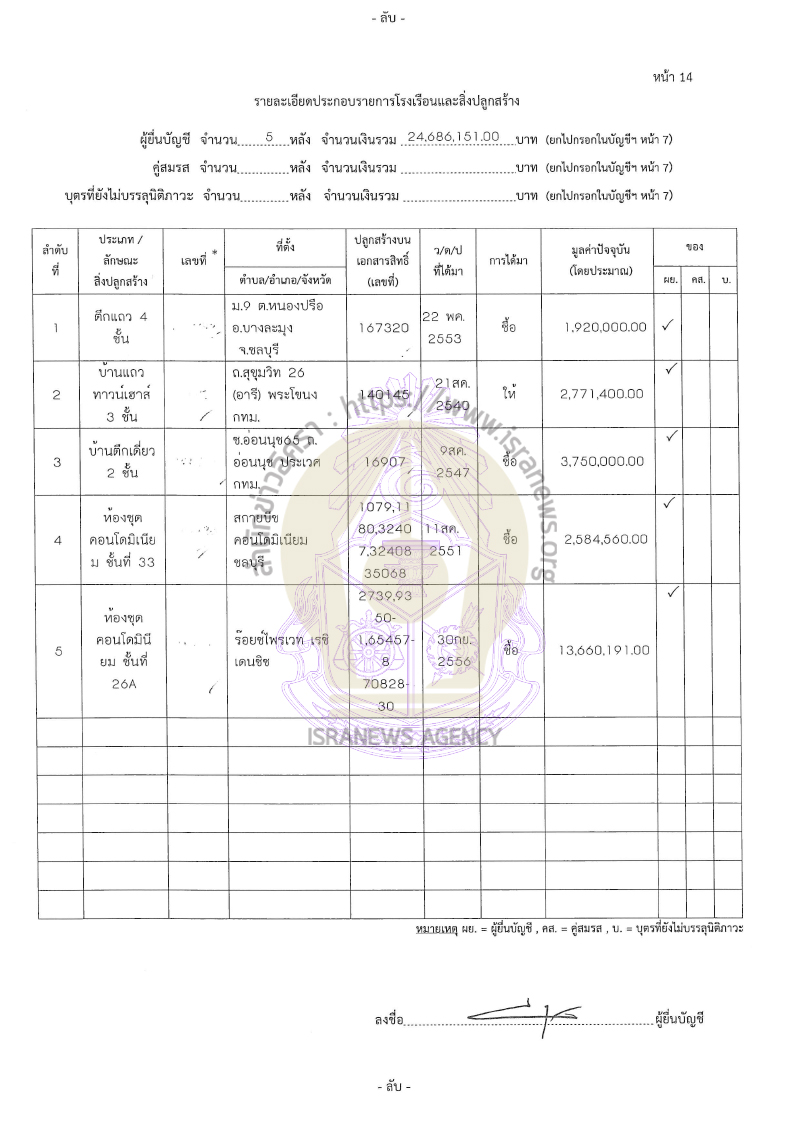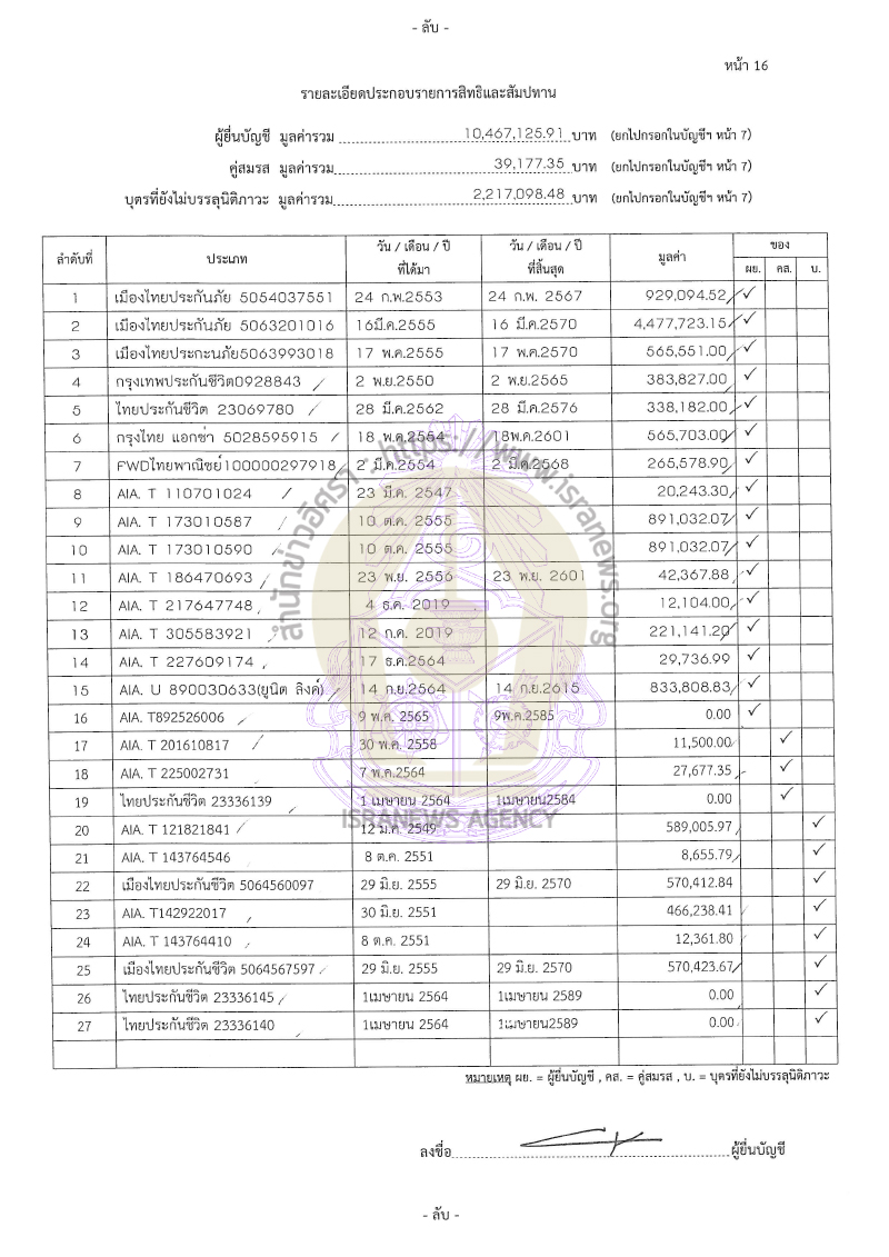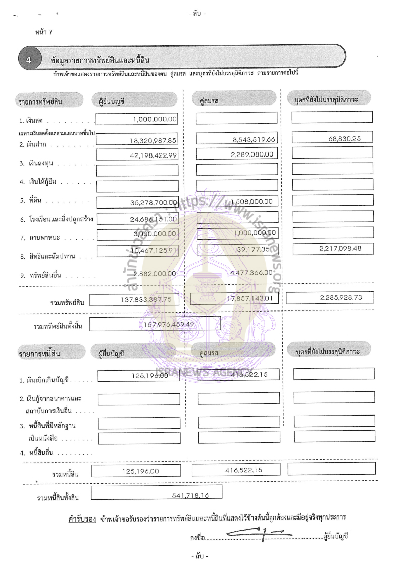 บุตรที่ยังไม่บรรลุนิติภาวะ แจ้งมีทรัพย์สิน 2,285,928.73 บาท จากเงินฝาก (5 บัญชี) 68,830.25 บาท สิทธิและสัมปทาน 2,217,098.48 บาท